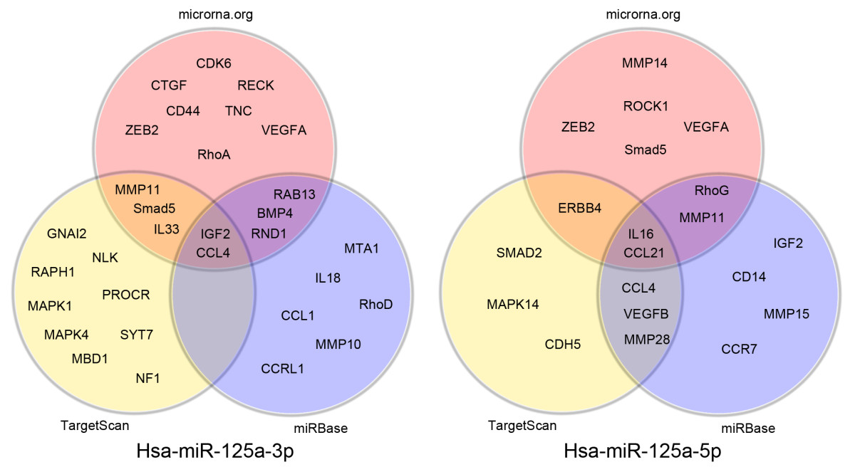According to predicted results from three webserver databases, CCL4 and IGF-2 were the most likely target genes of hsa-miR-125a-3p, while IL16 and CCL21 were the most likely target genes of hsa-miR-125a-5p. CCL4 (MIP-1beta), a member of the CC chemokine family, induces cellular migration and invasion through interactions with its receptor CCR5 [42, 43]. Nussbaum and colleagues [44] have reported that IGF-2 and its receptor IGF-2R stimulate tumor cell migration in human hepatocarcinogenesis. IL-16, an activator of the plasminogen-plasmin system, promotes human eosinophil migration into the extracellular matrix via a CCR3-chemokine-mediated signaling pathway [45]. Previous results from our laboratory indicated that CCR7 and its ligand CCL21 regulate migration and invasion of lung cancer cells through the ERK1/2 pathway under hypoxic conditions and promote metastasis of lung cancer [46]. Therefore, the complicated regulatory mechanisms controlled by hsa-miR-125a-3p and hsa-miR-125a-5p may play complex roles in migration and invasion. Despite the necessity for further studies to understand these mechanisms, our findings suggest a crucial role for miR-125a in lung cancer.