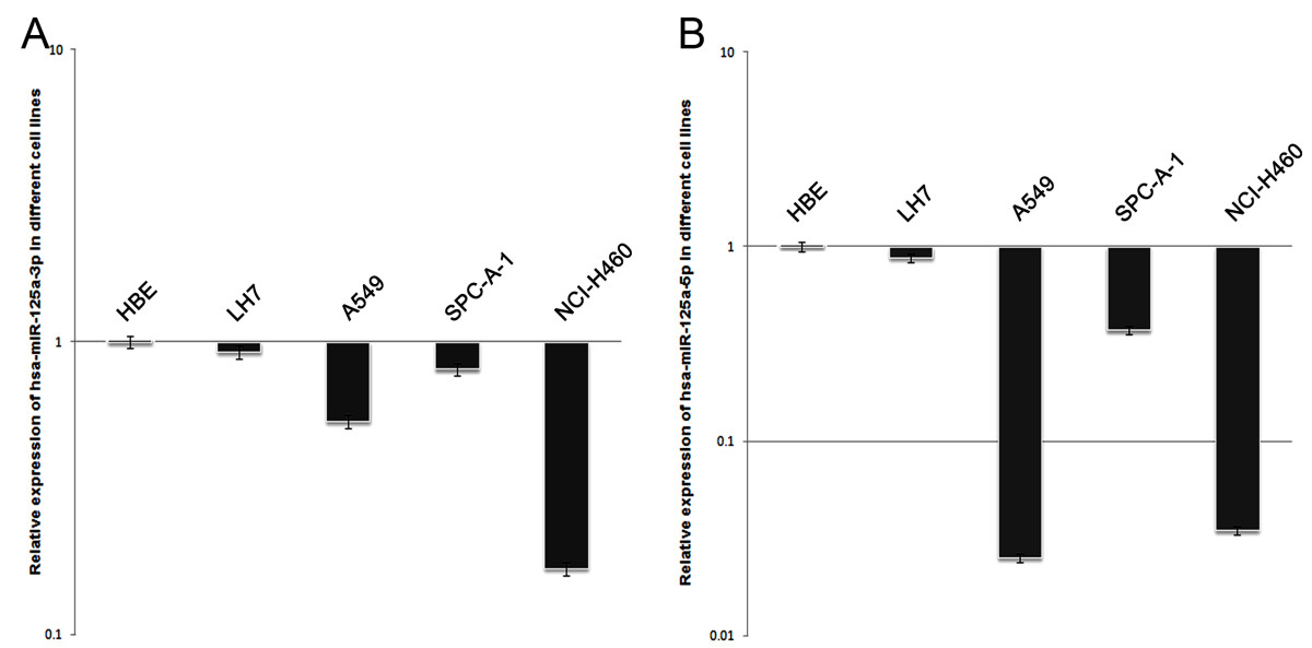 The SPSS 13.0 statistical software package was used for all analyses. For real-time PCR data, the statistical analysis of hsa-miR-125a-3p/5p expression levels in NSCLC tissues and corresponding LAC tissues was log2 transformed. Paired-samples T-test was used to analyze significant differences in hsa-miR-125a-3p/5p expression between NSCLC and LAC tissues. All values are expressed as mean ± SD. The Chi-square test was used to determine the relationship between hsa-miR-125a-3p/5p expression and clinicopathological variables. The two-sided Fisher's exact test to determine the relationship between hsa-miR-125a-3p/5p expression and clinicopathological variables when the number of tumors analyzed was less than 5 [21]. The Mann-Whitney test was used for pathological grade and clinical stage ranked data analysis. Spearman correlation analysis was used to determine the correlation between hsa-miR-125a-3p/5p expression and clinical stage and lymph node metastasis status. Other results were analyzed using independent samples T-test. Results were considered to be statistically significant at values of p < 0.05.