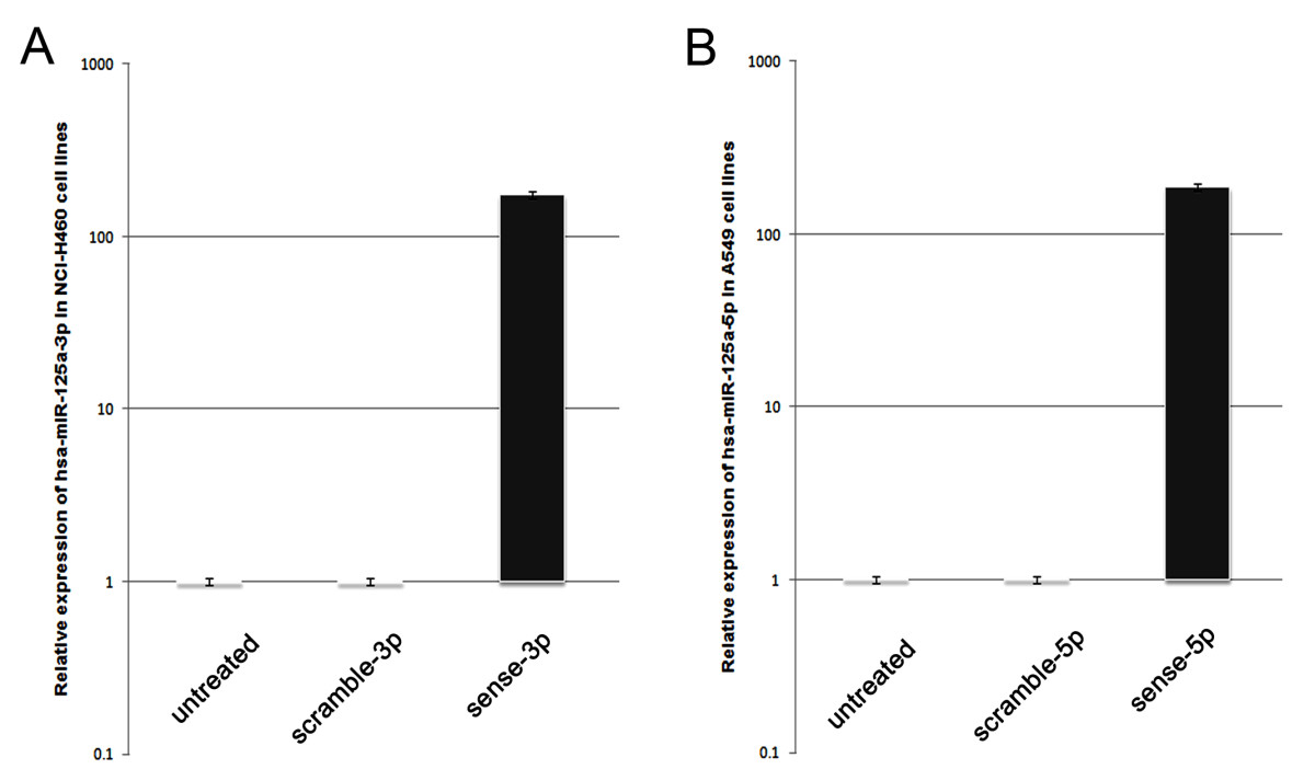 Depletion of hsa-miR-125a-3p/5p in the A549 and SPC-A-1 cell lines was achieved through transfection with antisense 2'-O-methyl oligonucleotides directed against hsa-miR-125a-3p/5p. Cells were transfected using Lipofetamine™ 2000 (Invitrogen) according to the manufacturer's protocol.