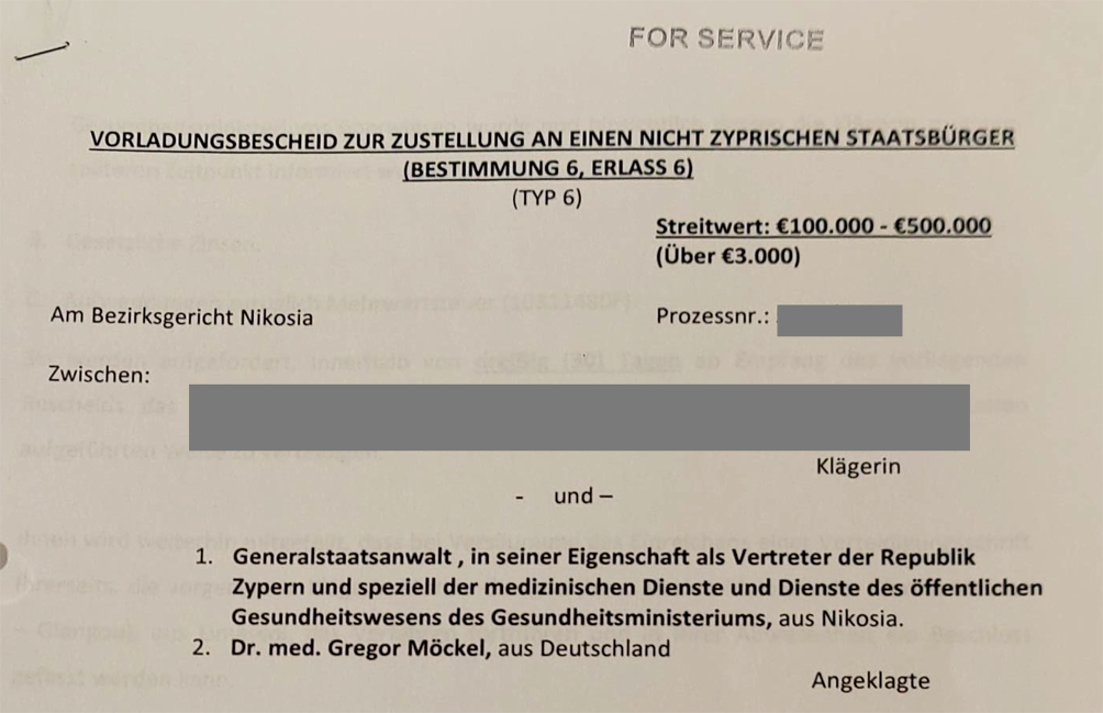 Vorladungsbescheid aus Nikosia/Zypern an Dr. Gregor Möckel