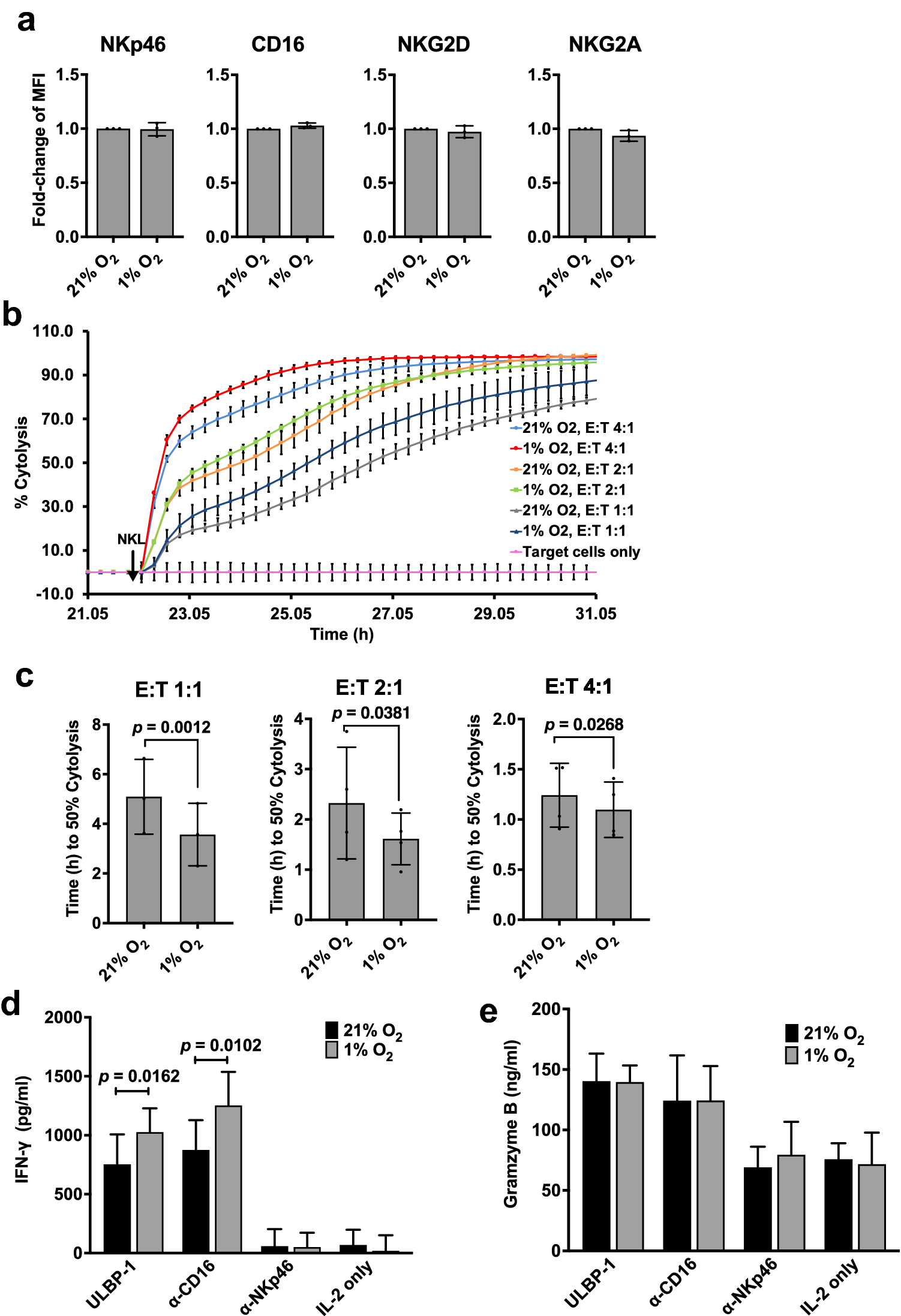 NK cells were plated 80,000 cells per 200 µL in a 96-well plate with 200 U/mL IL-2 and pre-incubated in 21% or 1% O2 for 24 h. Corning 96-Well TC-Treated Microplates were coated with 10 µg/mL of each antibody/ligand (Recombinant Human ULBP-1, R &D Systems #1380-UL-050; UltraLeaf anti-CD16 ab (3G8), Biolegend #302057; UltraLeaf anti-NKp46 ab (9E2), Biolegend #331947) for 3 h and then washed three times with 1 × PBS. After antibody/ligand coating of the plates, the NK cells were then transferred to the coated plate and incubated for 18 h in 21% or 1% O2. After incubation, cells were spun down at 300 × g for 5 min. Supernatant was removed and stored at -20 °C until ELISA was performed. Human IFN-γ was assayed with the human IFN-gamma DuoSet ELISA kit (R&D DY285B) and granzyme B was assayed with human granzyme B DuoSet ELISA kit (R&D DY2906-05) according to manufacturer’s instructions. Concentrations were drawn from a standard curve performed on each plate.