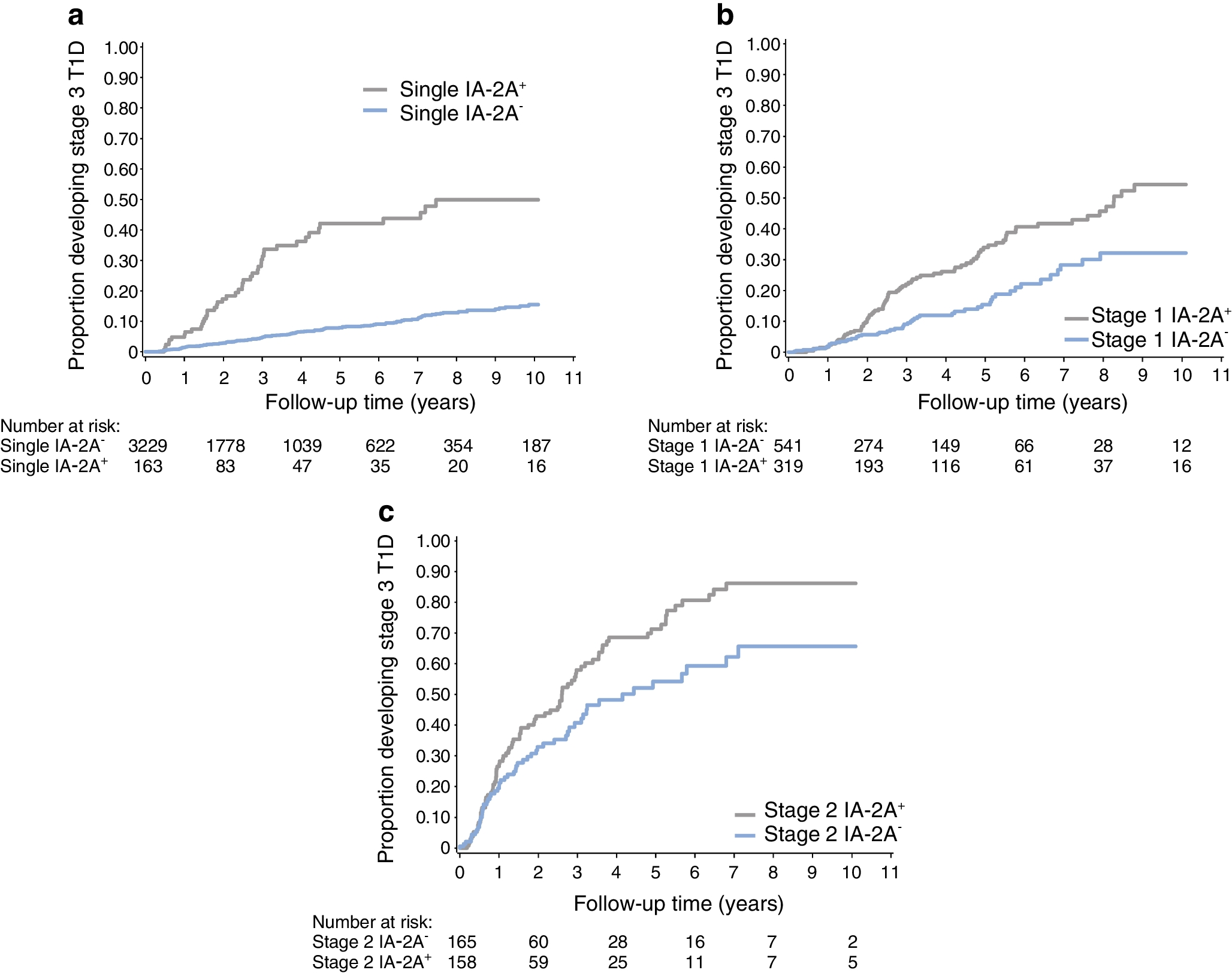 − status, rather than quantification of titre elevation, as a pragmatic read-out that could be easily applied across screening and testing platforms. However, as noted in our single-autoantibody analysis, titres could be applied to optimise performance of this marker. Overall, our work complements and expands these combined analyses by demonstrating that, in a large group of individuals screened for IA-2A, the presence of IA-2A is associated with increased stage 3 type 1 diabetes risk at all stages of islet autoimmunity and is linked to more rapid progression in individuals positive for IA-2A alone than in those at stage 1 who are IA-2A