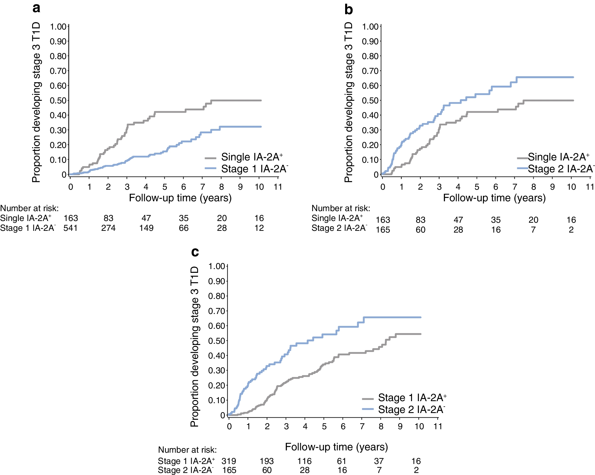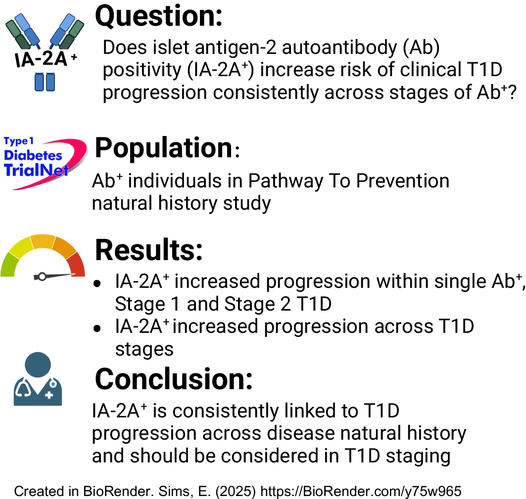 In conclusion, our analyses suggest that, particularly for individuals identified as autoantibody positive via cross-sectional screening, the presence of IA-2A positivity at baseline is linked to increased risk of clinical diabetes progression. Cross-sectional screening for the presence of abnormal IA-2A provides important perspective on the natural history of type 1 diabetes and potentially could be applied to further hone and stratify disease staging. IA-2A positivity is particularly appealing for stratification of staging given that it is typically obtained as part of the staging process and thus would be a relatively simple, straightforward marker to interpret. Application could be relevant to diabetes prediction as well as enrolment into prevention studies. Especially given the substantial risk of progression for individuals with single-autoantibody positivity for IA-2A, IA-2A testing should be included as part of initial islet autoantibody screening. Furthermore, predictive implications of IA-2A positivity status should be tested and applied to risk estimations for individuals with autoantibody positivity to guide monitoring approaches and consideration for disease modification aimed at prevention and delay.