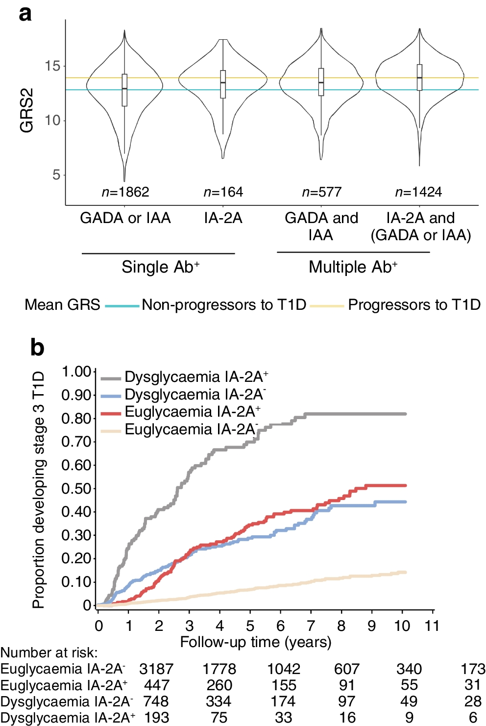 4]. However, additional individual features could more precisely define the varying rates of progression within staging categories. This is especially critical in single-autoantibody-positive individuals who exhibit early signs of islet autoimmunity but who, as a group, are traditionally categorised as low risk and so are not even included in current asymptomatic type 1 diabetes ‘staging’ paradigms. Such increased precision could ultimately improve management and prevention strategies as well as inform efforts to understand mechanisms underlying different immunomodulatory therapies. In the current work, we identify IA-2A positivity as a feature consistently associated with increased genetic risk and rates of clinical diabetes progression before, within and across early stages of type 1 diabetes. In fact, the presence of a positive IA-2A titre without dysglycaemia was associated with only slightly lower risk of clinical disease progression than IA-2A