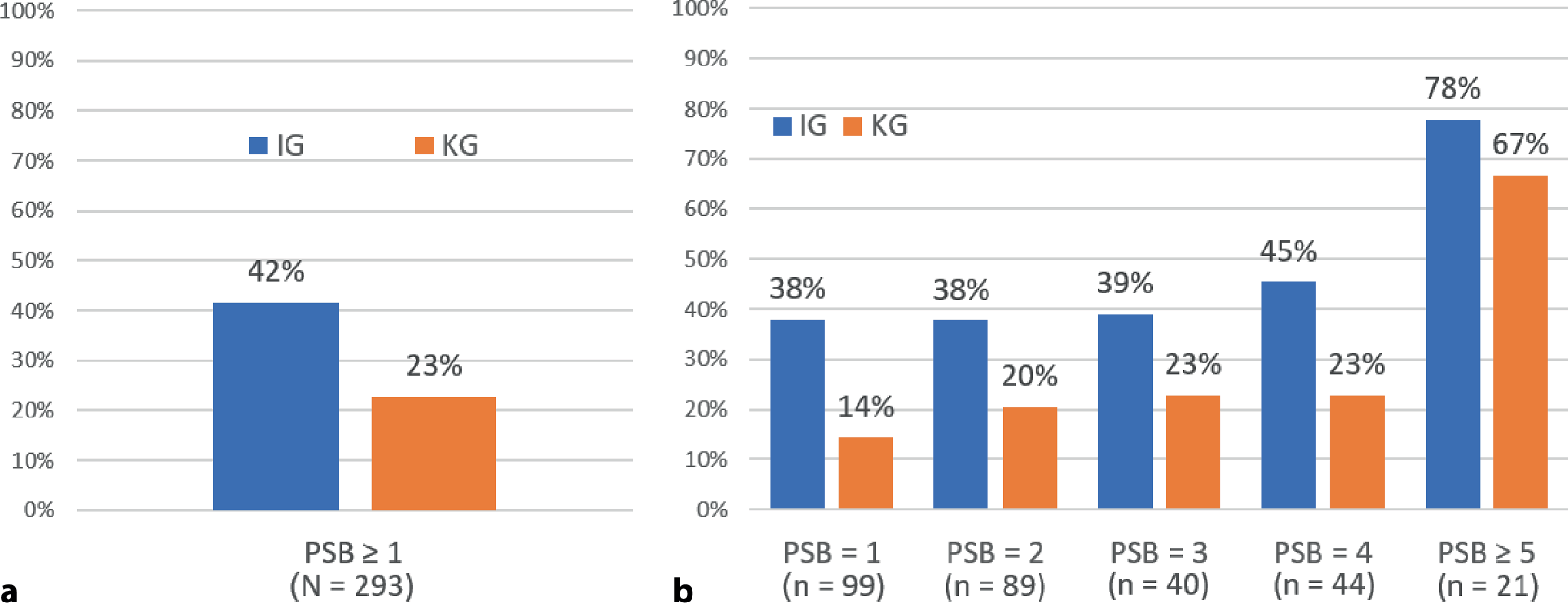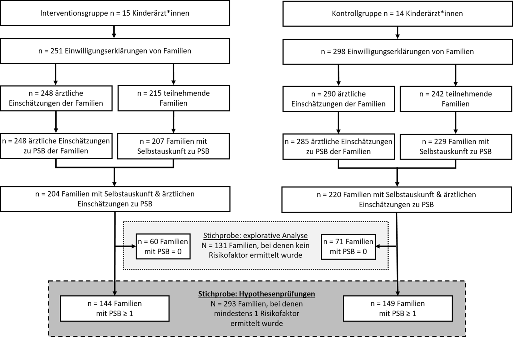 Im vorliegenden Beitrag wird die Wirkung der PATH-Intervention auf die Identifikation psychosozial belasteter Familien betrachtet. Dieser Aspekt ist von besonderer Relevanz, da das Erkennen einer psychosozialen Belastung nicht nur den ersten Schritt des Vermittlungsprozesses in Angebote der Frühen Hilfen darstellt, sondern darüber hinaus eine wichtige Voraussetzung für jedwedes Eingehen auf psychosoziale Belastungen durch Pädiater*innen ist. Als Hauptfragestellung des vorliegenden Beitrags prüfen wir deshalb, ob die PATH-Intervention die Identifikation psychosozial belasteter Familien durch Praxispädiater*innen verbessert. Unsere Hypothese lautet: Der Anteil identifizierter psychosozial belasteter Familien ist bei Praxispädiater*innen, die an der PATH-Intervention teilgenommen haben (Interventionsgruppe, IG), höher als bei Praxispädiater*innen, die nicht an der PATH-Intervention teilgenommen haben (Kontrollgruppe, KG).