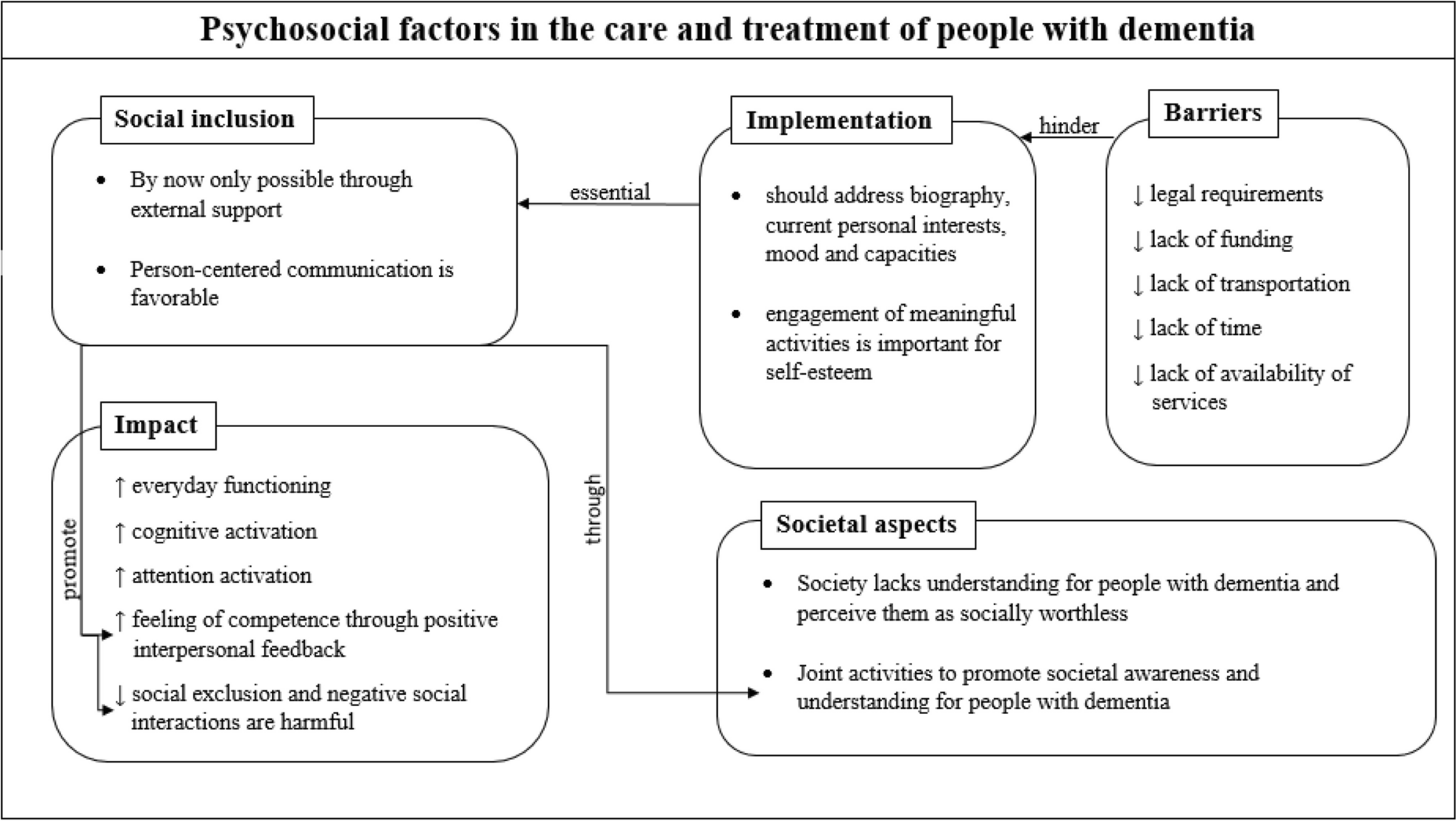 Six categories emerged from qualitative analysis, (1) Integration in everyday (professional) life, (2) Effects on dementia symptoms, (3) Preservation of a positive self-image, (4) Organizational aspects in everyday (professional) life, (5) Societal challenges, and (6) Role of informal caregivers. Key findings from the interviews are presented in Fig. 1 and provide a framework to illustrate the interplay of components that contribute to the inclusion of psychosocial factors in the care and treatment of people with dementia.