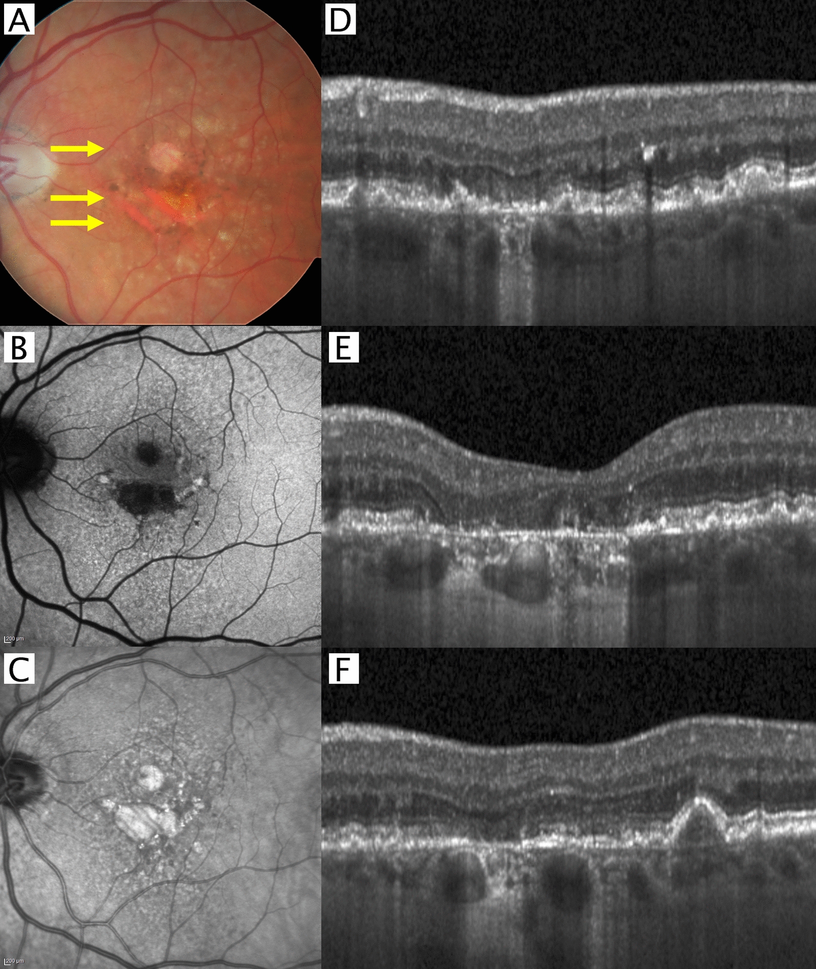 Major imaging modalities in a patient with geographic atrophy (GA) secondary to age-related macular degeneration (AMD). A Color fundus photography (CFP), B 488 nm wavelength fundus autofluorescence (FAF), C) Near-infrared reflectance (NIR) imaging, D-F) Optical coherence tomography (OCT) B-scans at the level indicated by the three yellow arrows in A