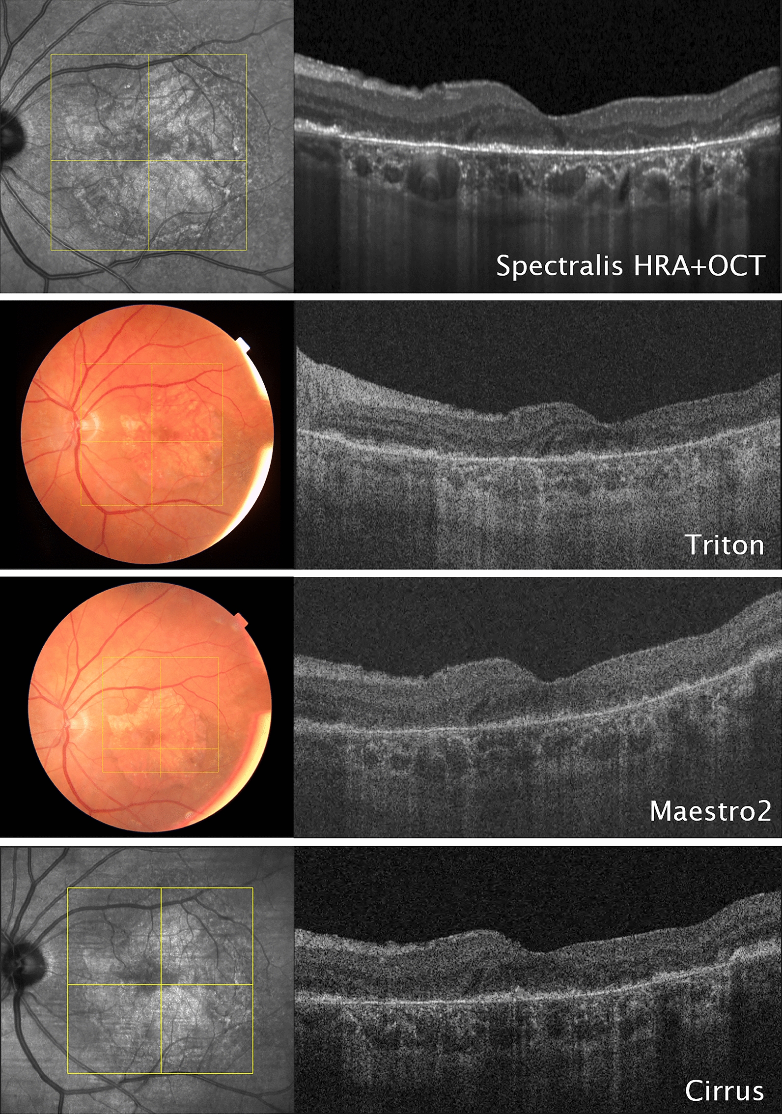 Influence of the device on the final optical coherence tomography (OCT) image within the same patient with geographic atrophy (GA). The Spectralis HRA + OCT (Heidelberg Engineering, Germany), Maestro2 (Topcon, Japan), and Cirrus HD-OCT (Carl Zeiss Meditec Inc., USA) are spectral-domain OCTs. While the Spectralis and Cirrus simultaneously generate a near-infrared reflectance (NIR) image, the Maestro2 acquires a color fundus photograph (CFP). The Triton DRI (Topcon, Japan) is a swept-source OCT and acquires a CFP