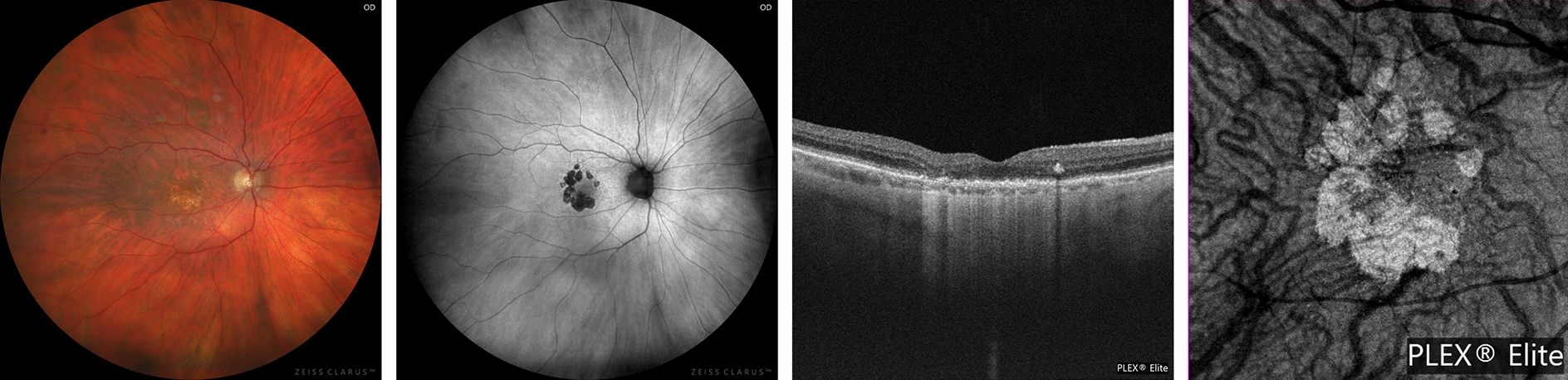 Representative images from a patient with geographic atrophy (GA). Fundus photography (left image) shows the area of GA as a hypopigmented region with increased visibility of the choroidal vessels. The same area (middle-left image) appears hypoautofluorescent on green autofluorescence imaging. On structural optical coherence tomography (OCT, middle-right image), GA is seen as a region characterized by the triad of retinal pigment epithelium (RPE) absence, associated photoreceptor loss, and hypertransmission signal in the choroid. By using a slab below Bruch’s membrane, an en face image can be obtained (right image), highlighting the hypertransmission defects (hyperTDs) secondary to RPE atrophy