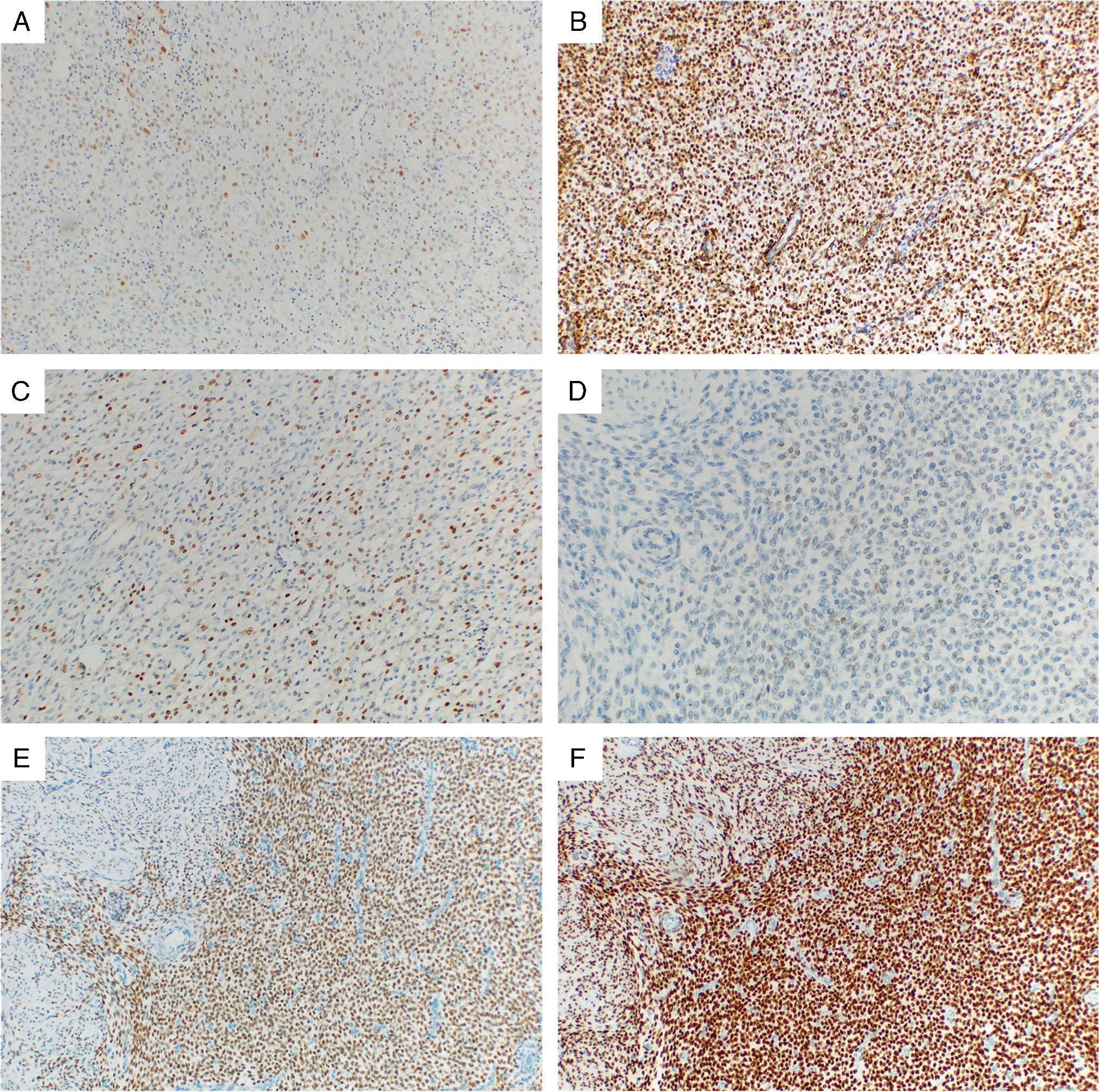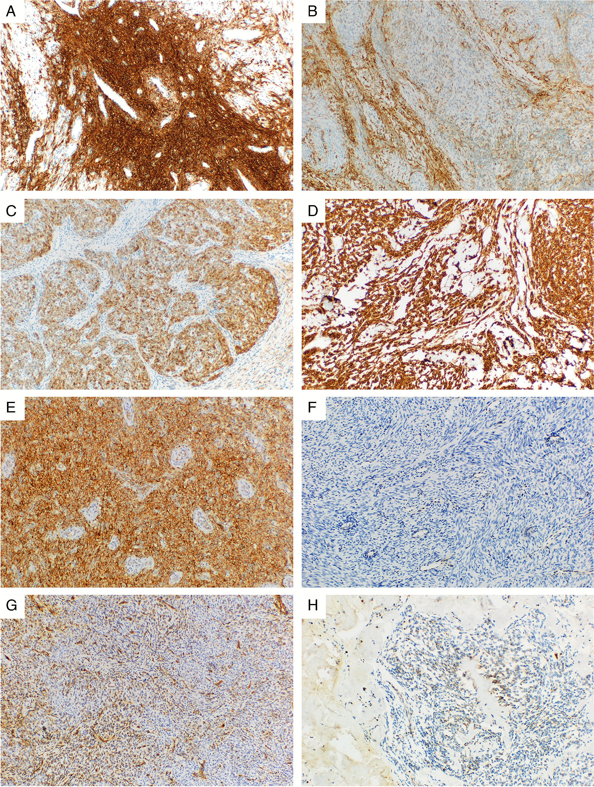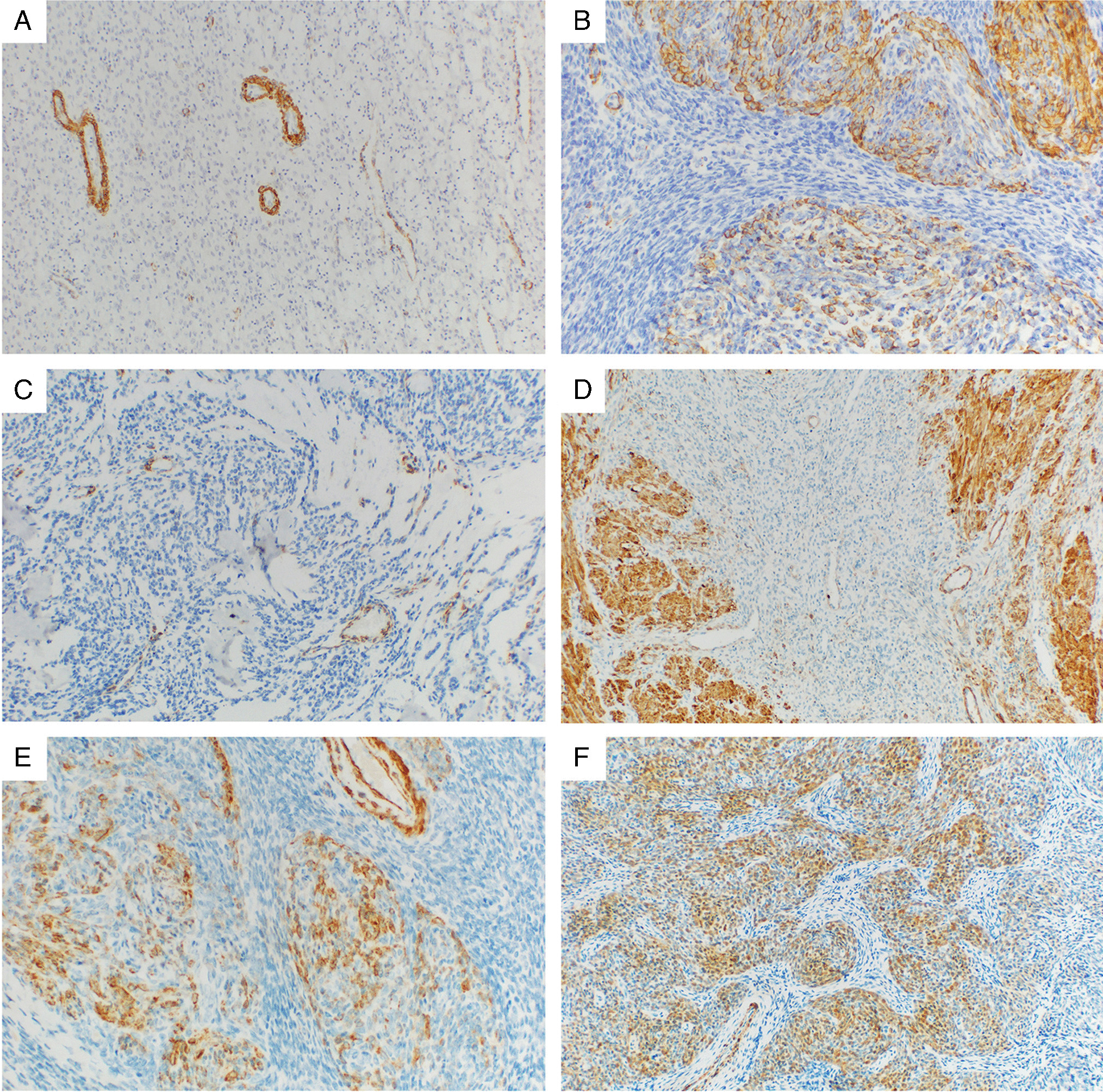 Immunohistochemistry was performed on 4 µm thick section using the TMAs. In cases where the TMA approach was not possible, particularly due to small tumor size or technical difficulties during sample processing, whole-tissue sections were used where possible. The IHC was evaluated independently by two pathologists (MKB, MF). The antibodies used for IHC examination were selected based on their diagnostic utility, with an emphasis on ruling out the other entities most commonly involved in the differential diagnosis. The whole panel was comprised of estrogen receptor (ER), progesterone receptor (PR), alfa-smooth muscle actin (α-SMA), desmin, h-caldesmon, calponin, CD10, IFITM1, transgelin, BCOR, BCORL1, NTRK, S-100, HMB45, CD117, WT1, SMARCA4 (BRG1), SMARCB1 (INI1), SMARCA2, ALK, ROS1, p53, smoothelin, and cyclin D1. The complete list of antibodies used, including their clones, dilution, and manufacturers is provided in Table 1.