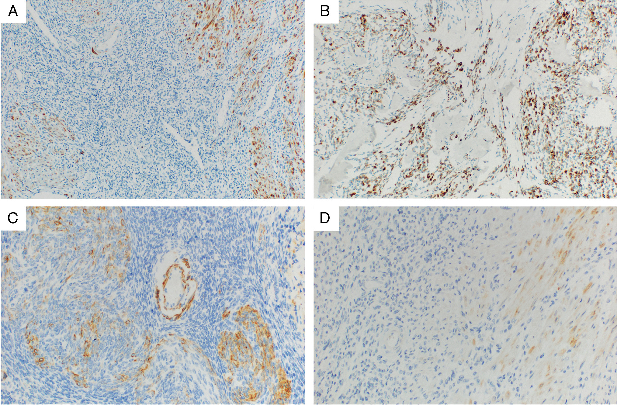 A detailed overview of the IHC results is provided in Table 2. The IHC testing for all antibodies was not possible in all of the cases due to limited material. Representative images of selected IHC markers are provided in Figs. 1, 2, 3, and 4. The cohort consisted of 122 cases (83%) of LG-ESS with the usual morphological pattern, 5 cases (3%) with pure fibroblastic pattern, and a single case each (0.6%) displaying predominant smooth muscle-like morphology or a glandular pattern. Fourteen tumors showed a mixed pattern—most commonly usual + fibroblastic (n = 7.5%) and usual + smooth muscle-like (n = 2.1%), while 6 cases (4%) showed a sex cord-stromal component of variable extent. Two cases (1%) were made up of a mixture of fibroblastic and myxoid patterns, and one case displayed a combination of usual, fibroblastic, and myxoid morphology.
