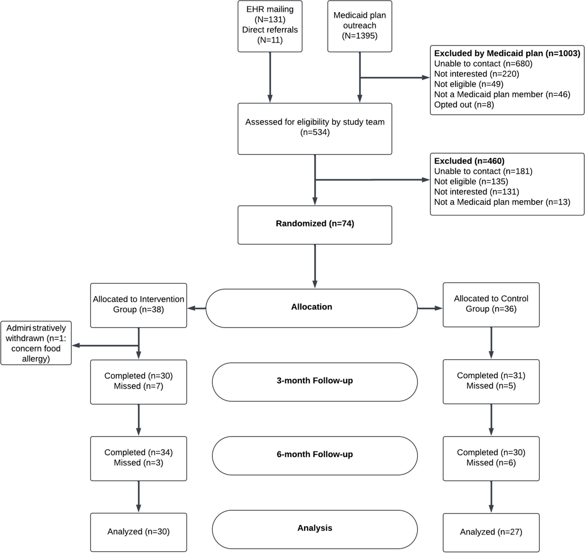 Participants were recruited via mailed study flyer with opt-in and opt-out options. Ten days after the mailing, participants were called by Medicaid plan staff to assess interest and confirm basic eligibility. Participants were then connected directly to the study team who conducted full assessment of eligibility over the phone, followed by in-person visit. Partway through the study, we additionally took direct referrals from primary care clinicians who could contact the study team for eligibility assessment.