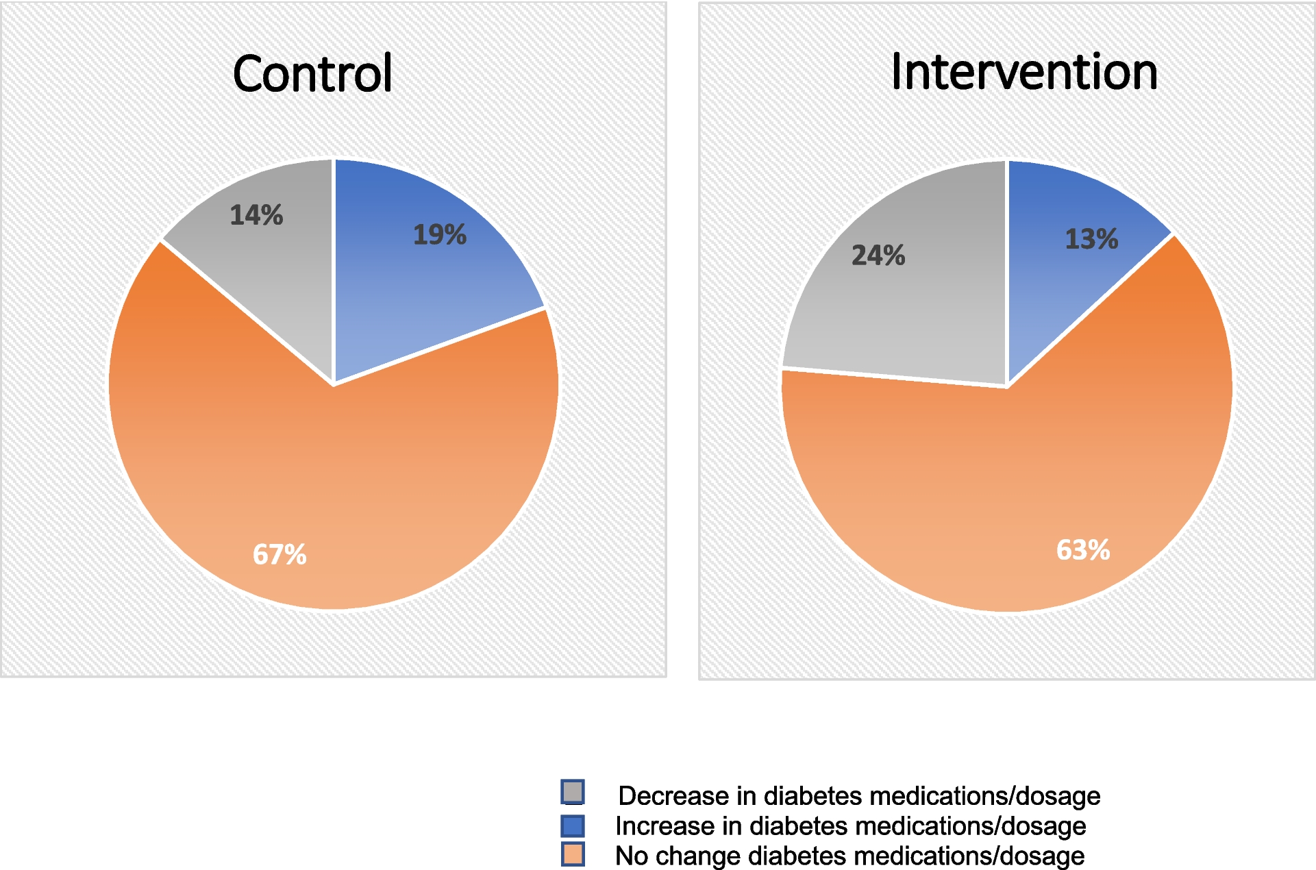 We summarized baseline characteristics of participants using means for continuous variables and counts/percentages for categorical variables. Analyses of outcomes were limited to those with A1c data at baseline and 6 months; no imputation was used. We used paired t-tests to conduct difference-in-differences analyses of change in the primary and secondary outcomes from baseline to 3 or 6 months between the two groups. We examined within-group changes from baseline to 3, 6, or 12 months as applicable. We used a p value of 0.05 to indicate statistical significance for all analyses. We originally proposed a sample size of 100 participants (50 per arm), which would provide 80% power to detect a difference of 1.14% in A1c. However, being a pilot study, the main goal analytically was to get an estimate of the effect size of the intervention.