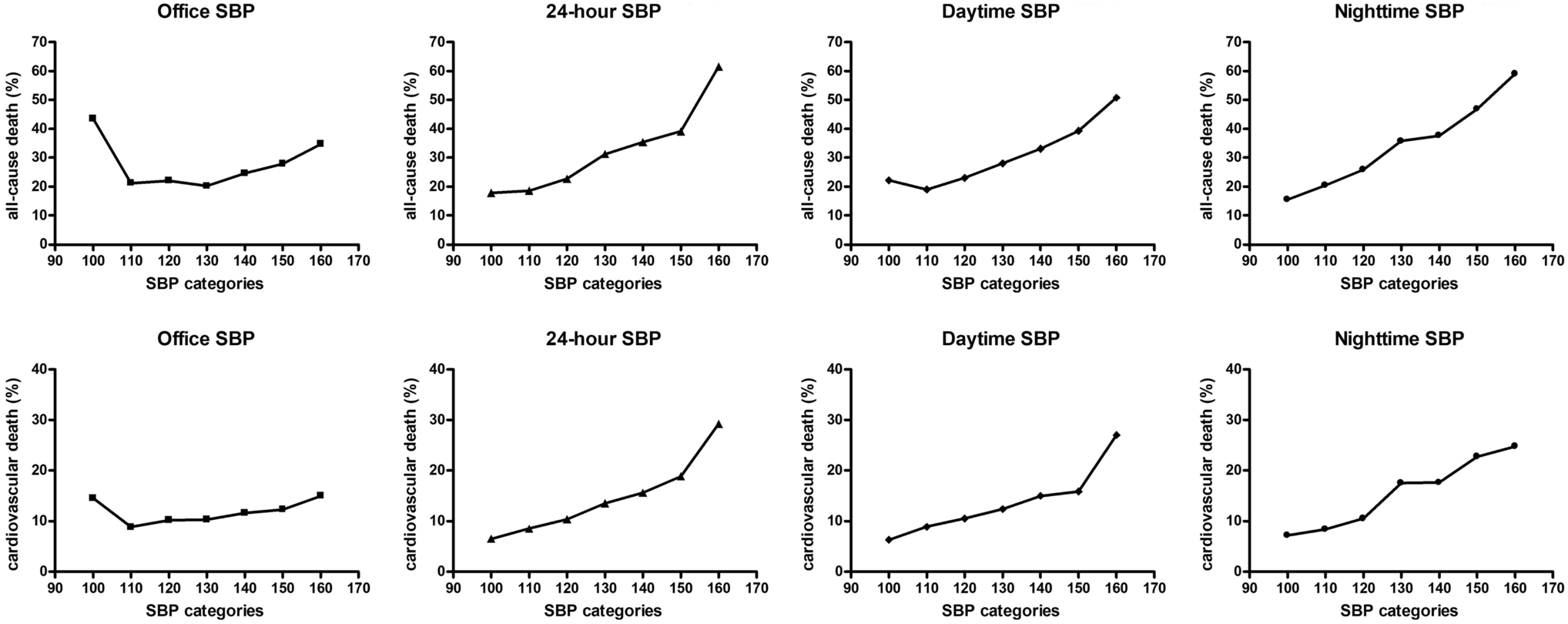 28]. It is noteworthy that hazard ratios for both daytime and nighttime SBP were similar and after simultaneous adjustment both indices maintained their association with all-cause and cardiovascular death. Although it has been clearly demonstrated that nighttime BP has a superior prognostic accuracy in relation to both cardiovascular events development and mortality in the general population of patients with hypertension [