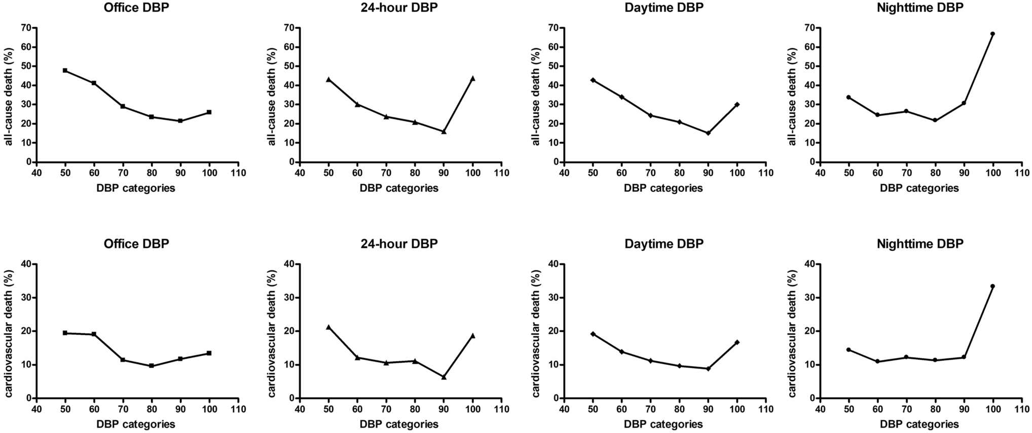 26] concluded that the impact of a riser pattern was lost when adjusted for absolute values of nocturnal BP. In the general population of patients with hypertension, we have reported that non-dipping was associated with all-cause and cardiovascular death, even in the absence of nocturnal BP elevation. However, nocturnal BP was a more powerful estimate than non-dipping [