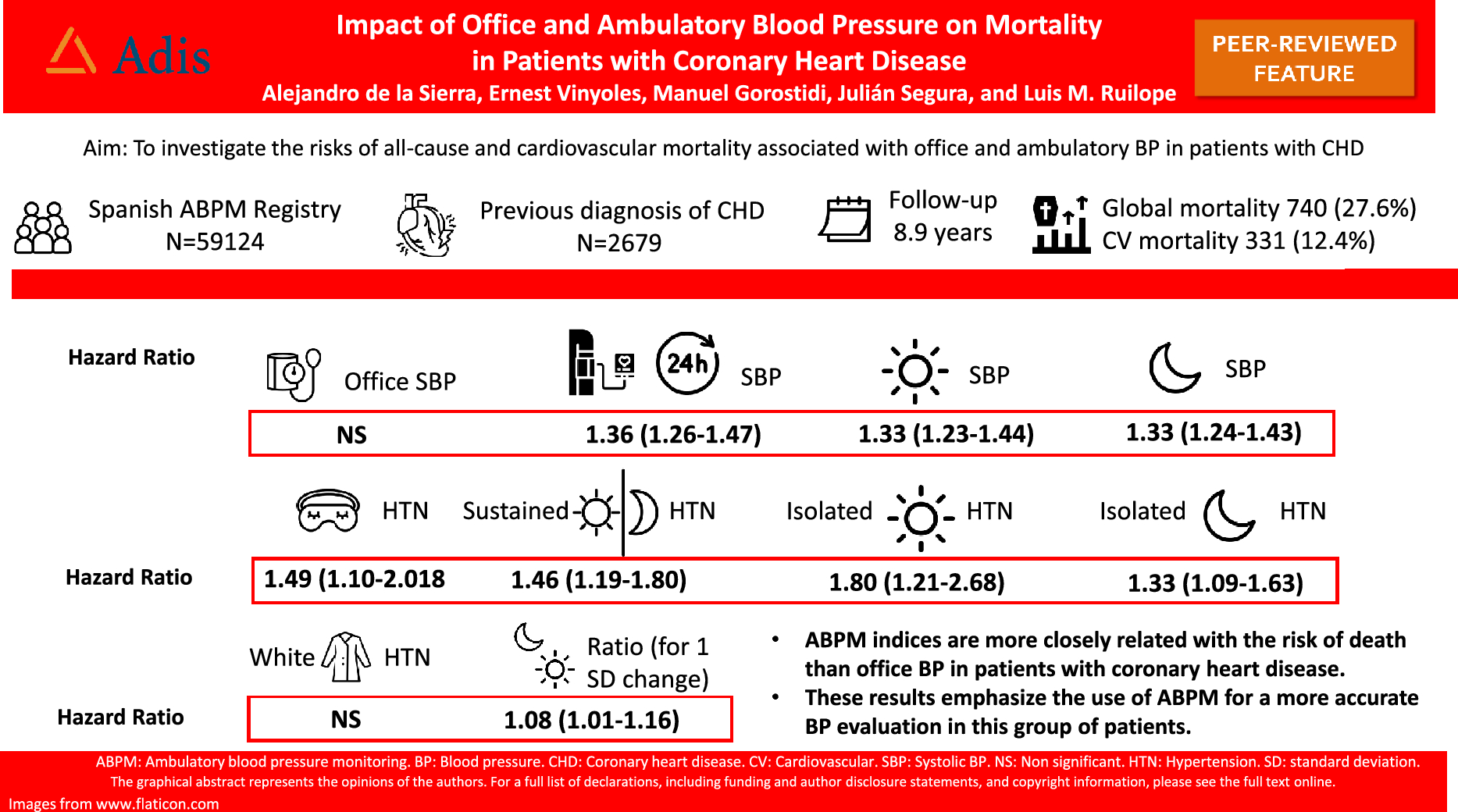 In this report, we aimed to investigate the risks of all-cause and cardiovascular mortality associated with office and ABPM-derived BP indices, including absolute office, 24-h, daytime and nighttime BP, combined clinic and ABPM phenotypes, isolated daytime and nighttime hypertension, nocturnal dipping and short-term BP variability in a large sample of patients with documented CHD (previous acute coronary syndrome or stable angina) recruited from the Spanish ABPM registry.