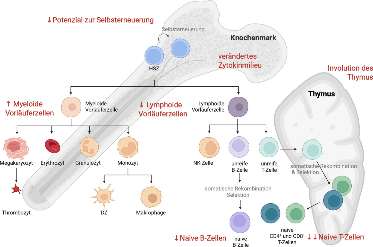 Alle Blutzellen entstehen im Knochenmark aus multipotenten hämatopoetischen Stammzellen (HSZ), die sich entweder selbst erneuern und wieder multipotente Stammzellen (Selbsterneuerung) hervorbringen oder zu myeloischen bzw. lymphoiden Vorläuferzellen differenzieren. Myeloide Vorläuferzellen entwickeln sich zu Erythrozyten, Megakaryozyten, aus denen Thrombozyten gebildet werden, Mastzellen, dendritischen Zellen (DZ) und Monozyten/Makrophagen. Aus den lymphoiden Vorläuferzellen entstehen natürliche Killerzellen (NK-Zellen), T‑Zellen und B‑Zellen. Die B‑Zellen entwickeln sich im Knochenmark und gelangen über den Blutkreislauf in die Lymphorgane. Die T‑Zellen verlassen das Knochenmark in unreifem Zustand und reifen im Thymus, bevor sie in die Blutzirkulation und andere Lymphorgane entlassen werden. Mit zunehmendem Alter kommt es zu funktionellen Veränderungen der HSZ. Die Zahl der HSZ nimmt zu, während das Potenzial zur Selbsterneuerung abnimmt. Es werden bevorzugt myeloide Vorläuferzellen gebildet, was zu einer reduzierten Produktion von lymphoiden Zellen führt [2]. Die oben erwähnten Prozesse der somatischen Rekombination und Selektion finden für T‑Zellen in einem spezialisierten Organ, dem Thymus, statt. Dieser wird mit zunehmendem Alter zurückgebildet (Involution), was eine der auffälligsten, altersassoziierten Veränderungen des Immunsystems darstellt. Die Produktion neuer, naiver T‑Zellen wird weiter einschränkt, was mit einer geringeren Vielfalt des T‑Zell-Repertoires und weniger Flexibilität bei der Antigenerkennung einhergeht [3]. Aufgrund einer veränderten Zytokinproduktion kommt es außerdem zur Selektion bestimmter HSZ-Klone mit genetischen und epigenetischen Veränderungen, was das Risiko für hämatologische Erkrankungen erhöht (Abb. 1).