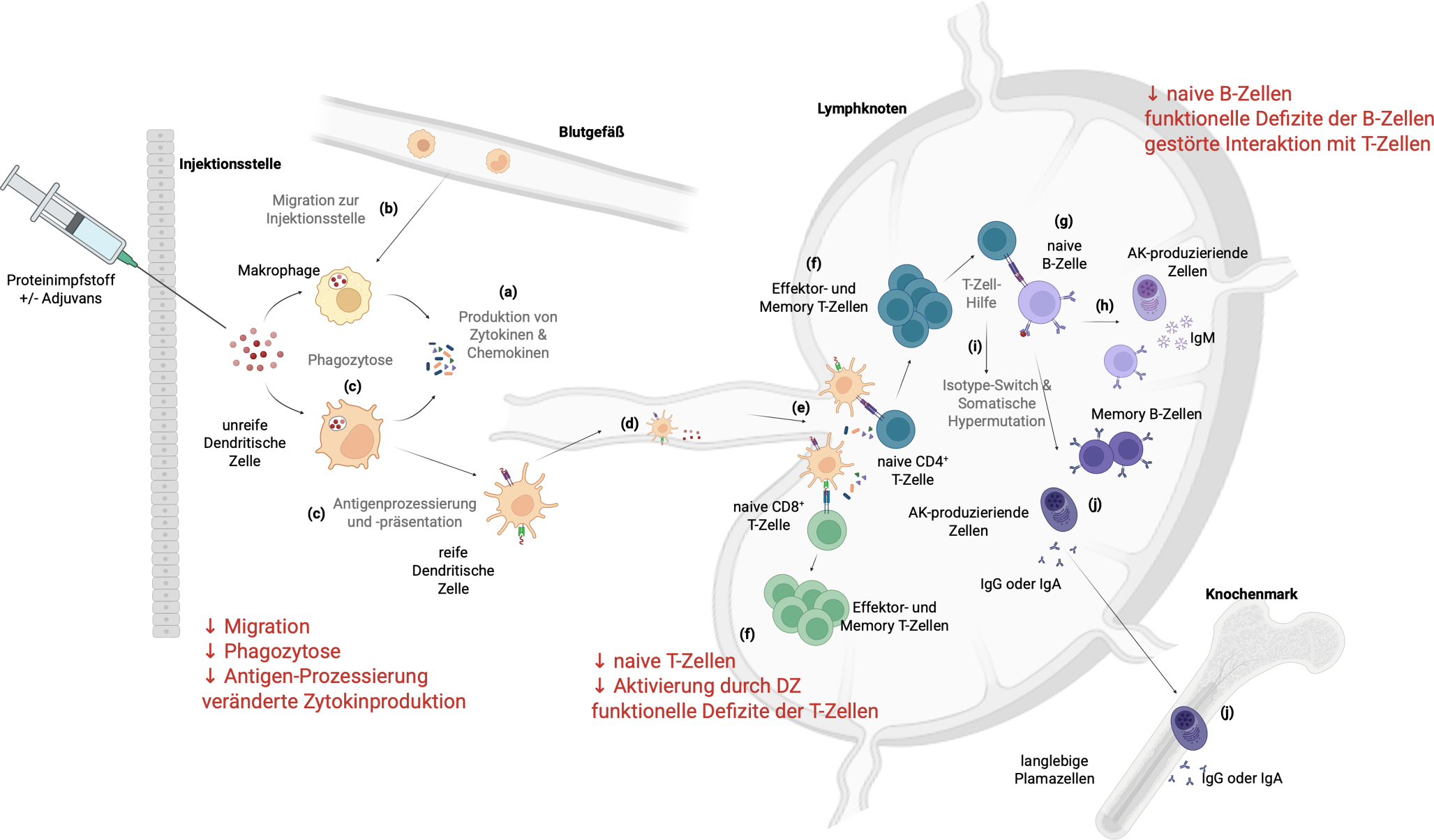 Schematische Darstellung der Immunantwort nach Impfung mit einem Proteinimpfstoff. Die einzelnen Schritte sind mit (a)–(j) bezeichnet und sind auch im Text so dargestellt. Altersassoziierte Veränderung sind in roter Schrift angeführt. AK Antikörper, DZ dendritische Zelle, Ig Immunglobulin. Created in BioRender. Weinberger, B. (2025) https://BioRender.com/j0zdalw