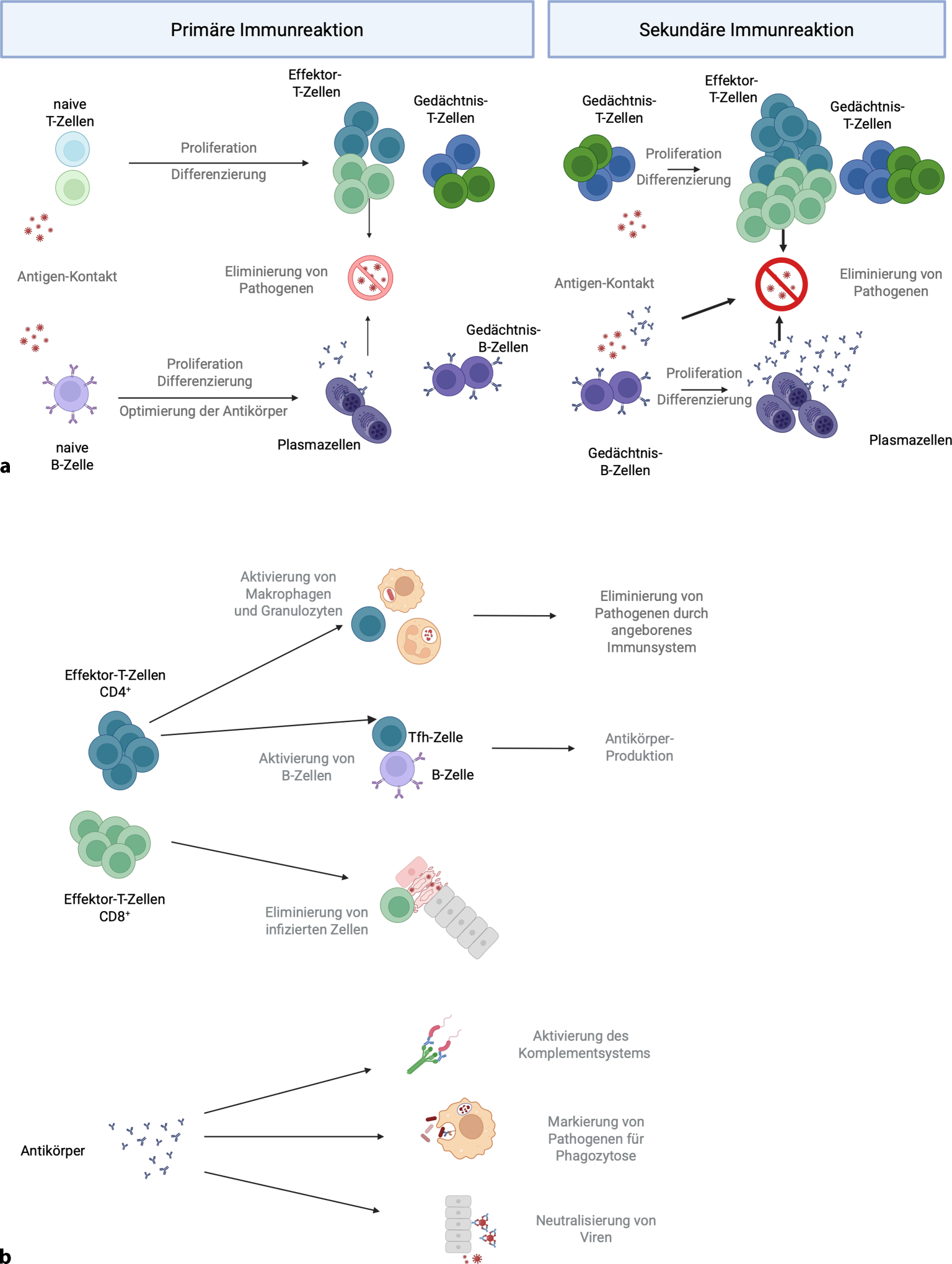 Das immunologische Gedächtnis ist dafür verantwortlich, dass manche Infektionen nur einmal durchgemacht werden oder bei wiederholtem Kontakt weniger schwer verlaufen. Allerdings ist dies aufgrund der Variabilität vieler Pathogene (z. B. verschiedene Virusstämme oder Serotypen) und der Tatsache, dass nicht gegen alle Pathogene ein ausreichend langlebiges immunologisches Gedächtnis ausgebildet wird, nicht für alle Erkrankungen der Fall. Der durch Impfstoffe induzierte Schutz vor Krankheiten basiert auf Gedächtnis-T- und Gedächtnis-B-Zellen sowie zirkulierenden Antikörpern. Der erste Kontakt mit einem Antigen im Kontext einer Impfung oder Infektion führt zu einer primären Immunantwort, die die Bildung von Gedächtniszellen und optimierten Antikörpern auslöst. Bei einer erneuten Exposition proliferieren Gedächtniszellen schnell und differenzieren zu Effektorzellen, was eine wesentlich schnellere und effektive Immunantwort im Vergleich zur Primärantwort bedeutet (Abb. 3a). Effektor-CD4+-T-Zellen verstärken die Funktionen des angeborenen Immunsystems, z. B., indem sie Makrophagen und andere antigenpräsentierende Zellen aktivieren. Darüber hinaus laufen sekundäre Immunantworten in den Keimzentren, in denen T‑Zellen und B‑Zellen interagieren, effektiver ab, was die Antikörperproduktion verbessert. Effektor-CD8+-T-Zellen erkennen infizierte Zellen und eliminieren diese, um die Ausbreitung des Pathogens zu verhindern. Antikörper neutralisieren Pathogene, indem sie z. B. den Eintritt von Viren in Zielzellen blockieren. Sie verstärken außerdem die angeborenen Immunantworten, da Zellen des angeborenen Immunsystems und das Komplementsystem Pathogene, die Antikörper gebunden haben, erkennen und bekämpfen (Abb. 3b). Funktionelle Defizite der Immunzellen, z. B. in den Bereichen Signaltransduktion, Metabolismus und Zytokinproduktion, können zu reduzierten Effektorfunktionen und einer verringerten Pathogenabwehr führen [7, 8].