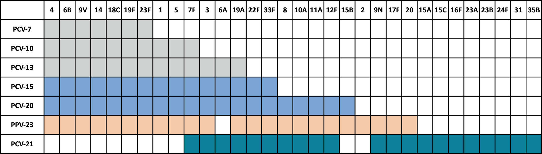 Serotypen in Polysaccharid(PPV)- und Konjugat(PCV)-Impfstoffen gegen S.pneumoniae. PPV „pneumococcal polysaccharide vaccine“, PCV „pneumococcal conjugate vaccine“