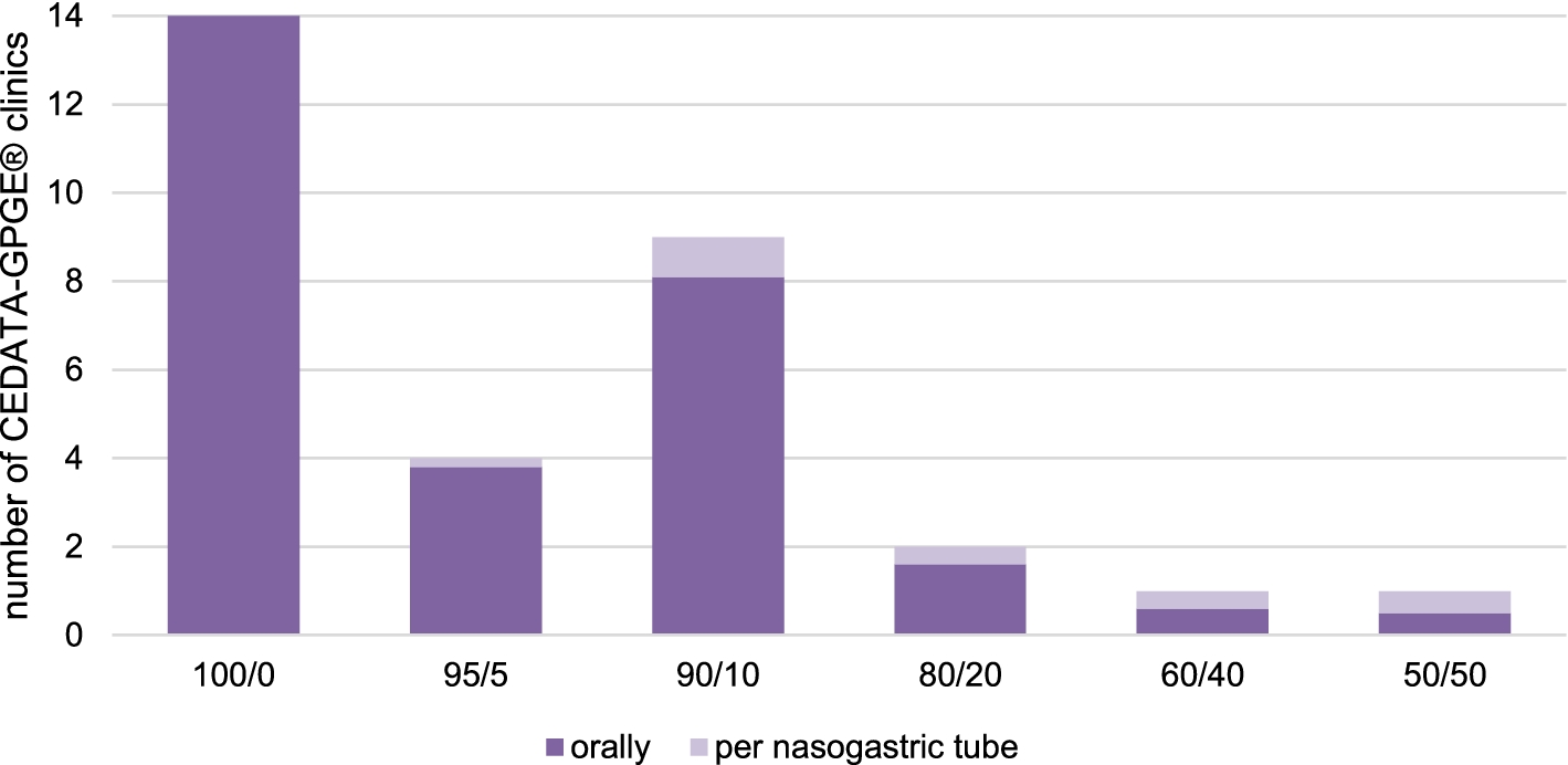Most respondents reported that they preferred to administer the formula orally to their patients: 45.2% (14/31) of CEDATA-GPGE® clinics treated the CD patients exclusively with orally administered formula during EEN and 29.0% (9/31) of the centers reported that 90% of the patients tolerated the formula orally and 10% required administration via a tube (Fig. 2). The percentages are the estimated values for the number of patients treated by the pediatric gastroenterologists, and specific patient numbers were not requested.