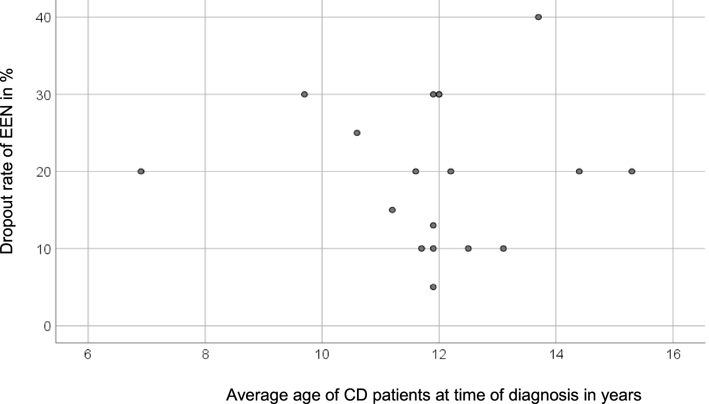 22.1% of the CD patients dropped out prematurely. There is no association between the dropout rate of EEN, and the average age of CD patients at the time of diagnosis (r = −.01, p = .968, N = 18) (Fig. 4).