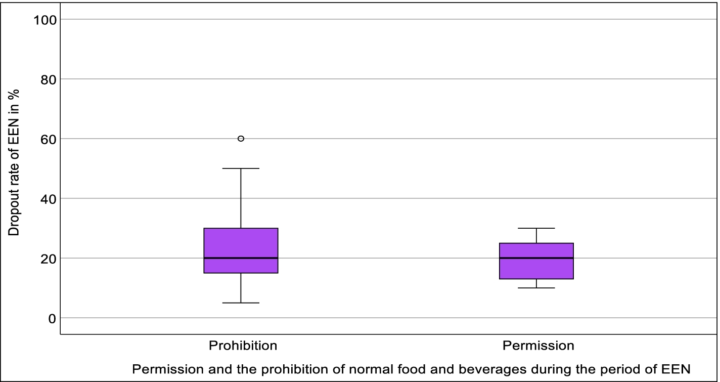 Association between the dropout rate of EEN and permission and prohibition of normal food and beverages during the period of EEN; Mann-Whitney U test; p > 0.05; N = 30. EEN, exclusive enteral nutrition (own illustration)