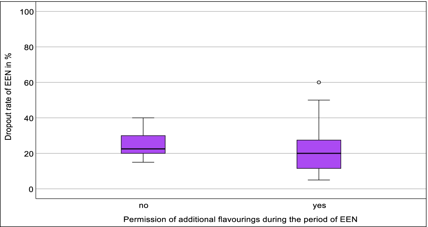 Association between the dropout rate of EEN and permission and prohibition of additional flavorings during the period of EEN; Mann-Whitney U test; p > 0.05; N = 30. EEN, exclusive enteral nutrition (own illustration)