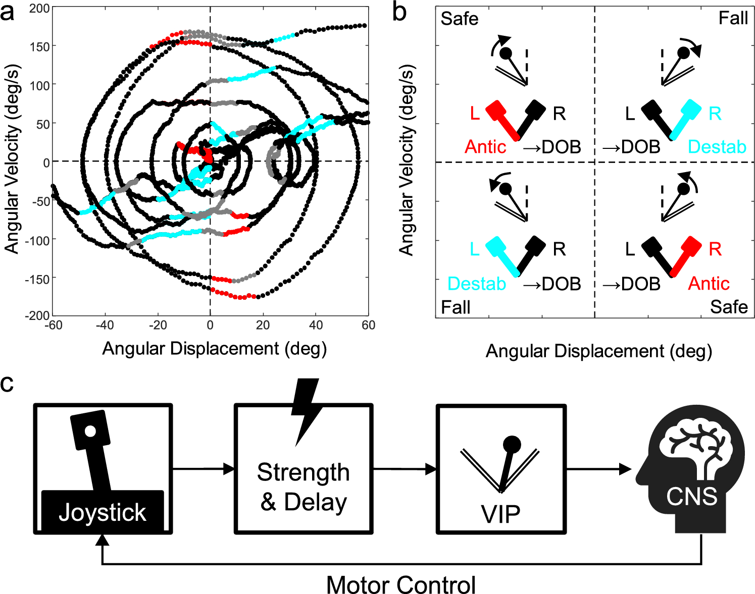 The experimental hypotheses and design aimed to understand the dynamics of the VIP balancing illustrated in Fig. 1. Figure 1a plots sampled VIP velocity versus position, with dot colors encoding functional types of joystick commands, which are illustrated in Fig. 1b, where the upper right (Q1) and lower left (Q3) quadrants are designated “Fall,” and the upper left (Q2) and lower right (Q4) quadrants of the same coordinate system are labeled “Safe.” In the Fall quadrants, the pendulum is leaning and moving toward a programmed boundary analogous to the ground plane in a bipedal stance; in the complementary Safe quadrants, the pendulum is moving toward the upright DOB. Entering a Fall quadrant can end in either a fall or an escape to the Safe quadrant; entering a Safe quadrant can end in transitions to Fall quadrants but not in a fall. In other words, falls are less imminent in the Safe quadrants. In the Fall quadrants of Fig. 1a, the dots are gray when the joystick is inactive (deflected less than 1°), black when active deflection accelerates the pendulum towards the DOB (corrective), and cyan when the deflections accelerate the pendulum towards a fall boundary that it is already approaching (destabilizing). In the Safe quadrants, gray and black represent joystick inactivity or acceleration towards the DOB, respectively, and red indicates joystick commands producing acceleration away from the DOB. Red dots might be interpreted as anticipatory—keeping the pendulum from overshooting the DOB—and the black dots represent further accelerating the pendulum approaching towards the DOB. The distinction between these two types of commands (black and red) in the Safe quadrants has been observed previously, but the distinction between corrective and destabilizing movements (black and cyan) in the Fall quadrants has not been conceptually or empirically distinguished in previous literature.