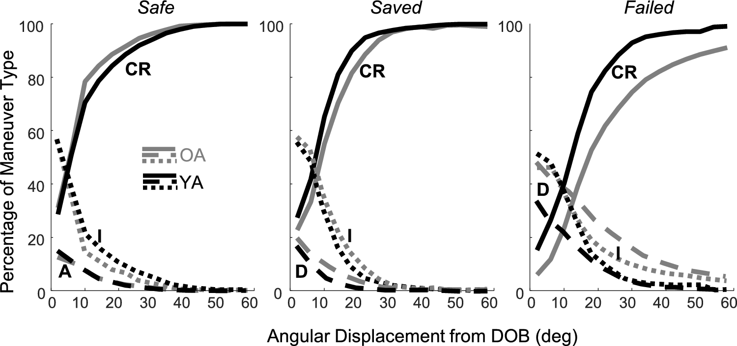 Joystick maneuvers as a function of the pendulum angular position, separately in three balancing regimes defined in the text: Safe, Saved, and Failed. OA are shown in gray and YA in black, and labels and line styles distinguish command types (I = dotted, CR = solid, A or D = dashed). For Safe and Saved balancing, the evolutions of all command types across pendulum positions are the same across age groups. However, in the Failed regime, near irrecoverable falls, major age-dependent degradation is apparent for OA—they make fewer corrective and more destabilizing commands