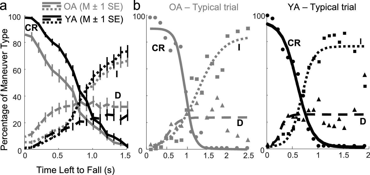 Age-dependent, regime-specific, and time-critical switching between balancing command alternatives. The observation that the age differences in command switching as a function of pendulum position occurred only in the dynamic regime where falls happen, and were reminiscent of logistic functions, motivated post-hoc analyses probing whether switching is time-critical. Guided by psychophysical and neurophysiological switching patterns for saccadic decisions (Schall and Thompson 1999; Salinas et al. 2010; Costello et al. 2013), we assessed whether VIP command switching improves or declines as the time before a fall shortens, leading to less time available for decision-making. This would predict that, in Failed balancing, (1) the rate of inactivity (I) should decrease (because something must be done) as the pendulum gets closer in time to contacting a fall boundary, and after the threshold for action is exceeded, (2) YA, who perform better, should switch faster and more successfully (increase CR and decrease D) than OA. We computed command probability as a function of time left to fall (TLTF), assessed logistic curve fits, and compared the fits with functionally relevant summary statistics. Logistic functions were the best fits (ranked 1st among 9 plausible monotonic functions) for I and CR for both age groups, and for D, it was the best for YA and the second-best fit for OA.
