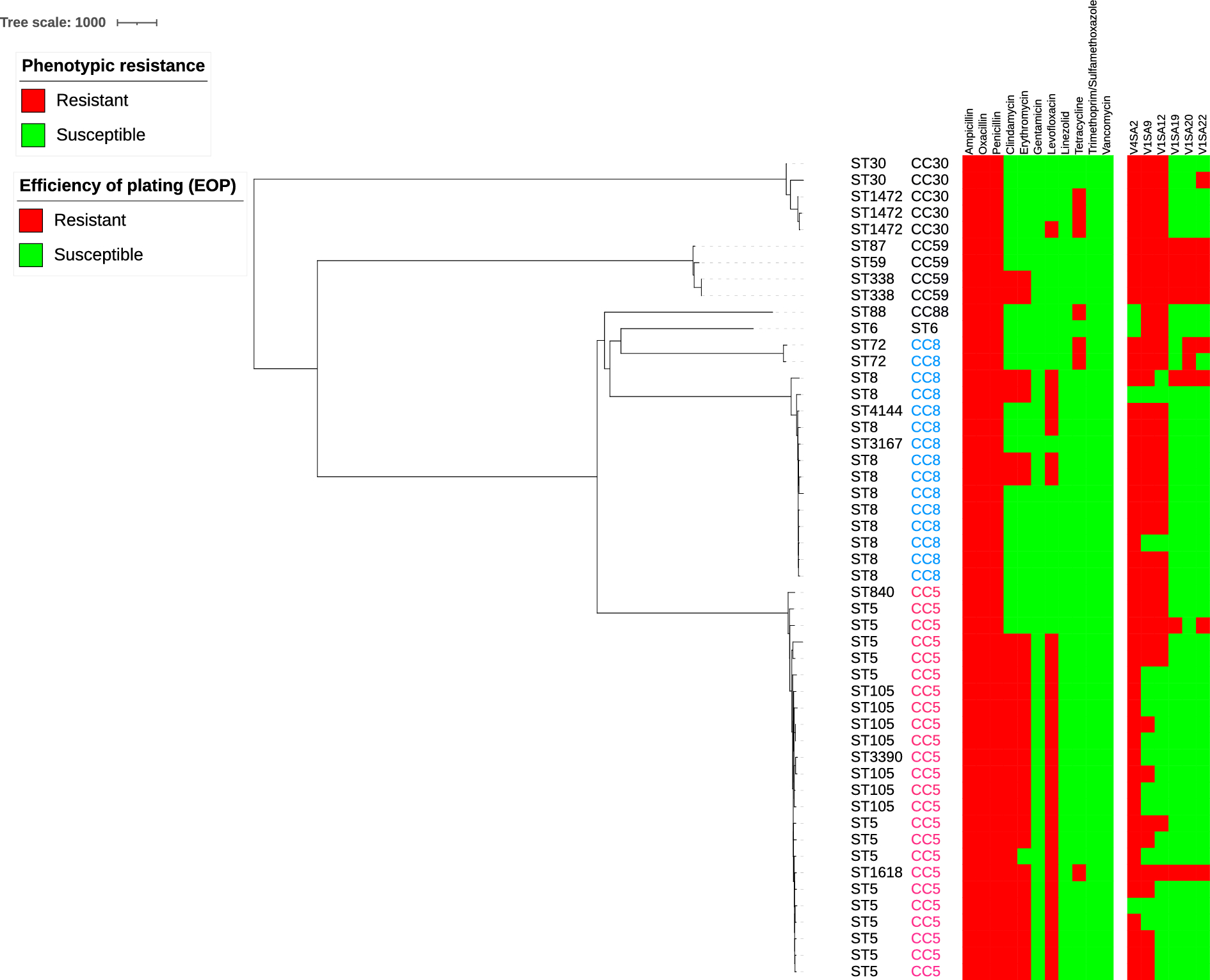 cgMLST-based phylogenetic relationships among ocular MRSA including phage and antibiotic susceptibility testing. CC5s are represented in pink and CC8s in blue