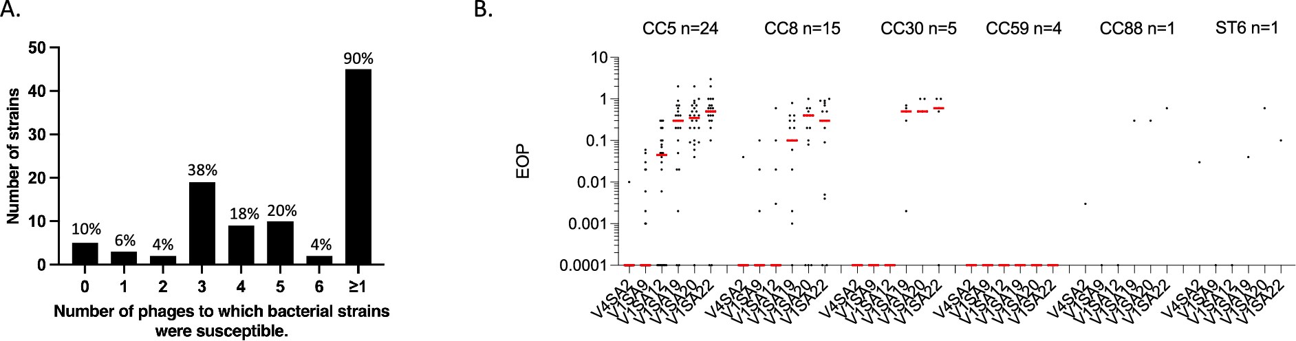 Phage activity against the collection of MRSA clinical isolates. A Number and proportion of bacterial strains susceptible to zero, one, two, three, four, five, six or at least one of the six tested phages. B EOP values for phage activity (V4SA2, V1SA9, V1SA12, V1SA19, V1SA20 and V1SA22) against different MRSA clonal complexes. One dot represents the mean of the three biological replicates obtained for one strain. Red bars represent the median EOP for each clonal complex
