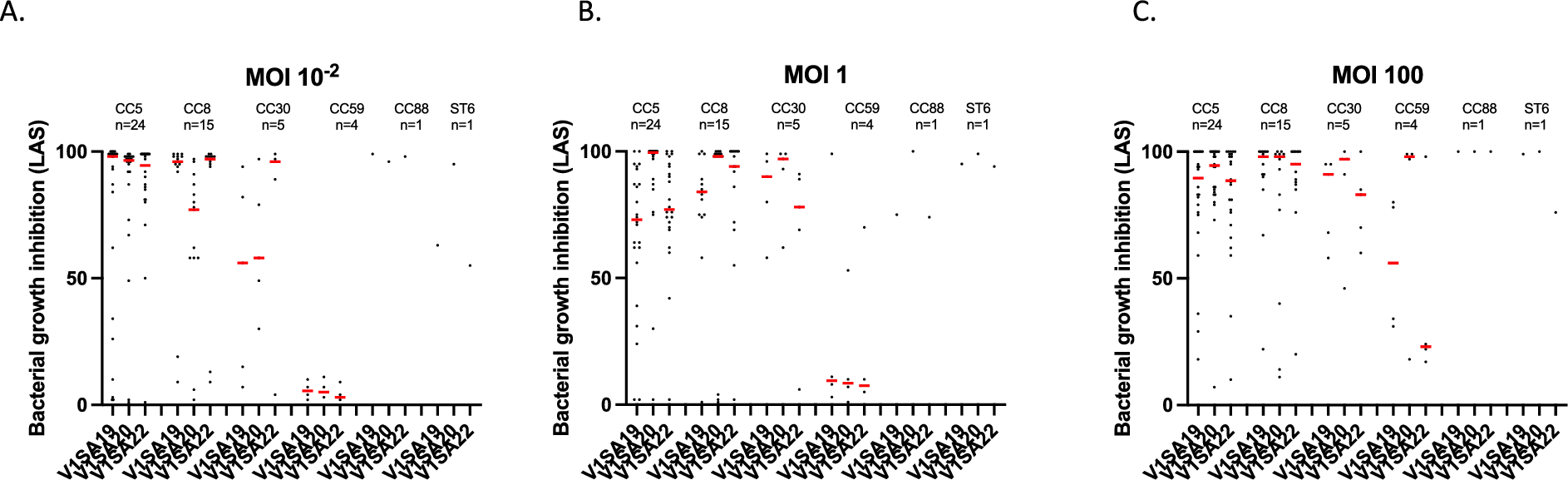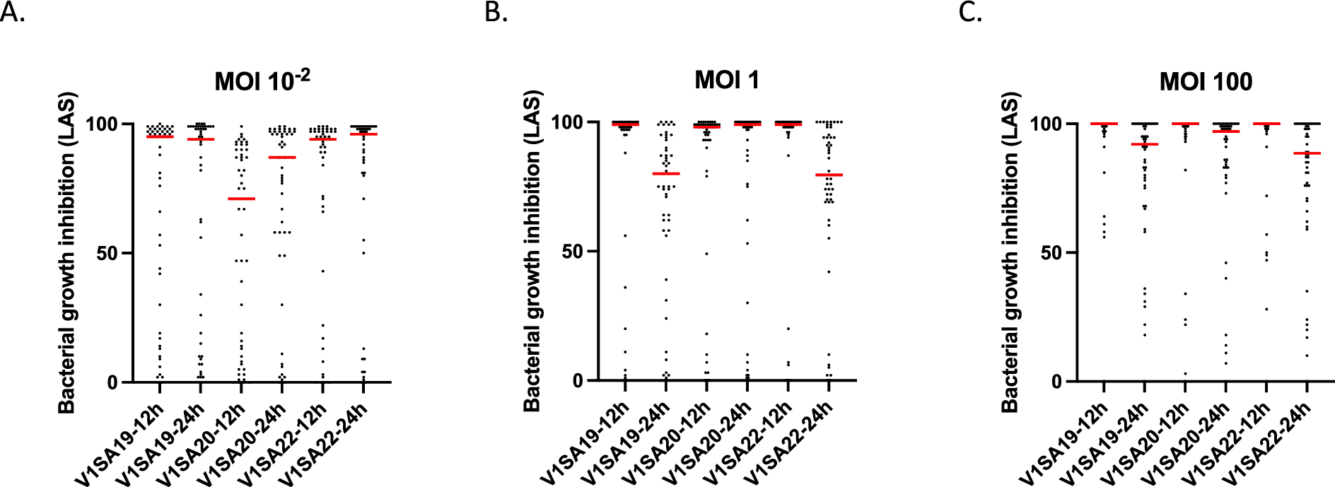 Activity of phages V1SA19, V1SA20 and V1SA22 in the liquid kinetic assay at 12 h and 24 h at MOI = 10–2 (A), MOI = 1 (B) and MOI = 100 (C). One dot represents the mean of the three biological replicates obtained for one strain. Red bars represent the median LAS for each phage