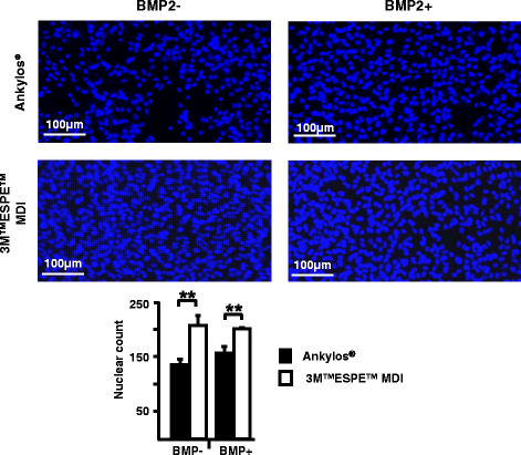 Our data suggest that the increased cell number is the primary reason why cultures grown on 3M™ESPE™ MDI deposited more minerals in comparison to those grown on Ankylos®. Taken together, we reject the null hypothesis, since our data demonstrates that MDIs have a superior surface quality that promotes cell proliferation, facilitating osseointegration. However, this needs to be tested in vivo.