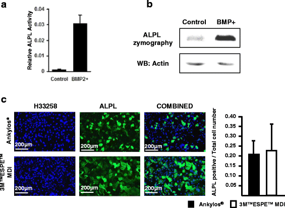 BMP-2-transfected C2C12 cells were fixed in 4% PFA for 15 min, and then blocked with 5% bovine serum albumin (Fisher, Pittsburgh, PA, USA) in Tris buffered saline-0.025%Triton for 30 min at room temperature, followed by overnight incubation with an anti-mouse alkaline phosphatase antibody (R&D systems, Minneapolis, MN, USA). Detection was done by Dylight 488 rabbit anti-goat secondary antibody (Jackson ImmunoResearch, West Grove, PA, USA) with 1-h incubation at room temperature. Fluorescence imaging was performed using an inverted microscope (EVOS FL, Thermo Fisher Scientific). ALPL assay using p-nitrophenyl phosphate was performed as described before [