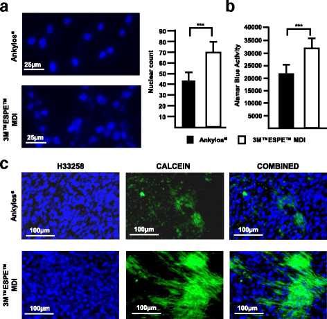 Our cell culture system was compatible with both cell types as evident by the outcome of various functional studies, which include cell adherence, synthesis of alkaline phosphatase, and mineralization of the ECM. However, there was a clear difference in the degree of biocompatibility between the two types of implant surfaces; the 3M™ESPE™ MDI showed higher cell numbers and increased deposition of calcium phosphate minerals in comparison to Ankylos®.