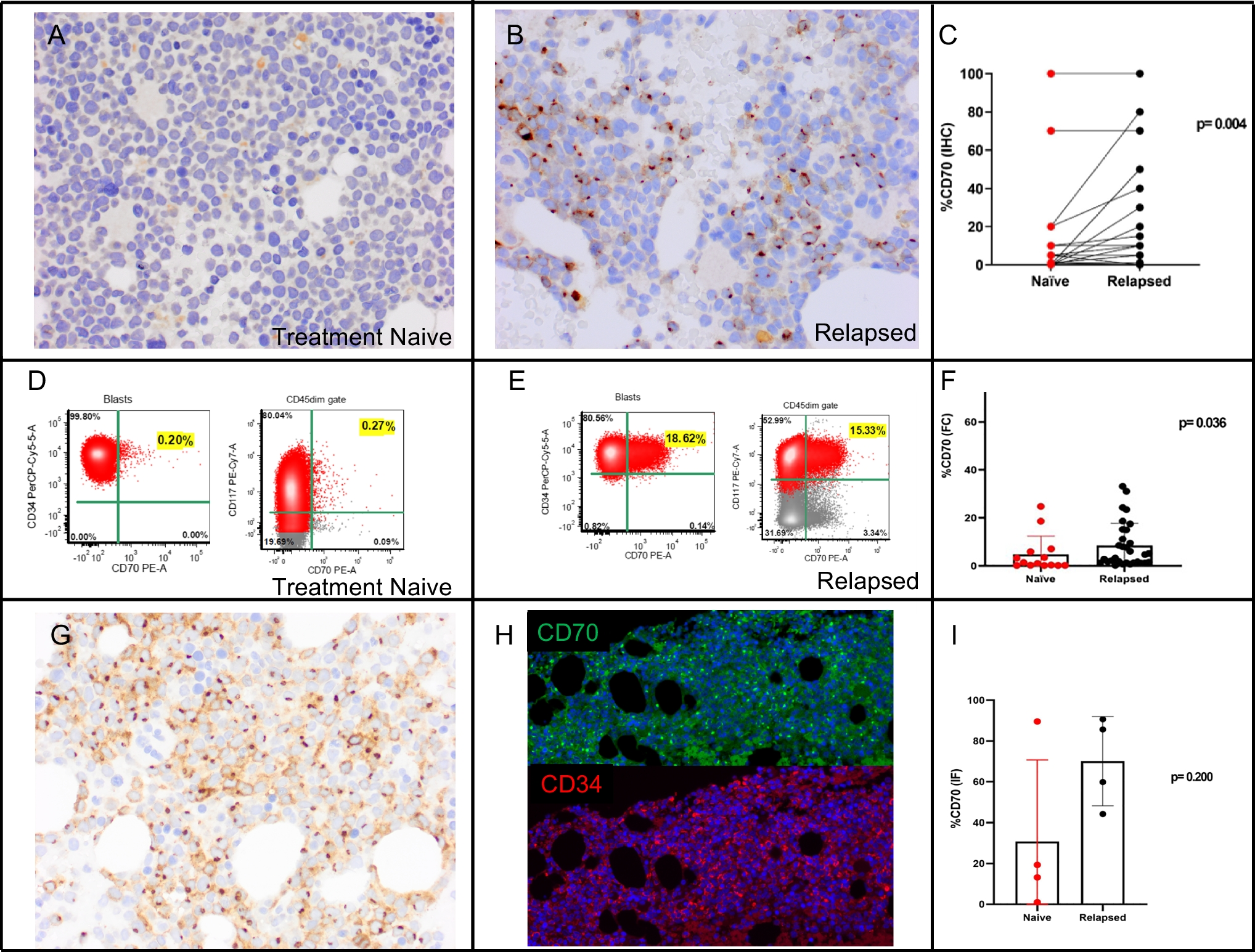 Examples of CD70 expression as detected by immunohistochemistry (IHC) and flow cytometry (FC) in treatment naïve and relapsed AML patients. A, B In this case, IHC for CD70 in a bone marrow clot was negative at diagnosis (A) and detected in about 50% of the blasts at the relapse one year later (B); a paired analysis of naïve and relapsed samples shows a significantly higher expression in the relapsed group (p = 0.004) (C). D, E FC of a naïve treated sample (D) shows expression of CD70 in 0.20% of the CD34+ blasts and 0.27% of CD117+ blasts, while at time of the relapsed demonstrates positivity for CD70 in 18.6% of the CD34+ blast population and in 15.3% of the CD117+ (E); an analysis using FC to compare naïve and relapsed samples shows a statistically significant higher expression in relapsed samples (p = 0.036) (F). G, H IHC for CD70 in a bone marrow clot of a newly diagnosed AML shows positivity in most of the blasts (G) and the dual immunofluorescence (IF) for CD34 (red)/CD70 (green) in the same specimen shows positivity in 89.6% of the blasts as quantified by digital imaging (H). A comparison using dual IF showed a higher expression in relapsed samples in comparison with naïve treated, although not statistically significant, likely due to the low number of samples with double IHC and IF staining (I). Note that the immunostaining pattern includes staining of the cytoplasmic membrane and a Golgi/paranuclear stain in most of positive blasts. Blasts with only a Golgi stain pattern are also seen, and if these blasts express CD70 at the level of the cellular membrane is unknown currently