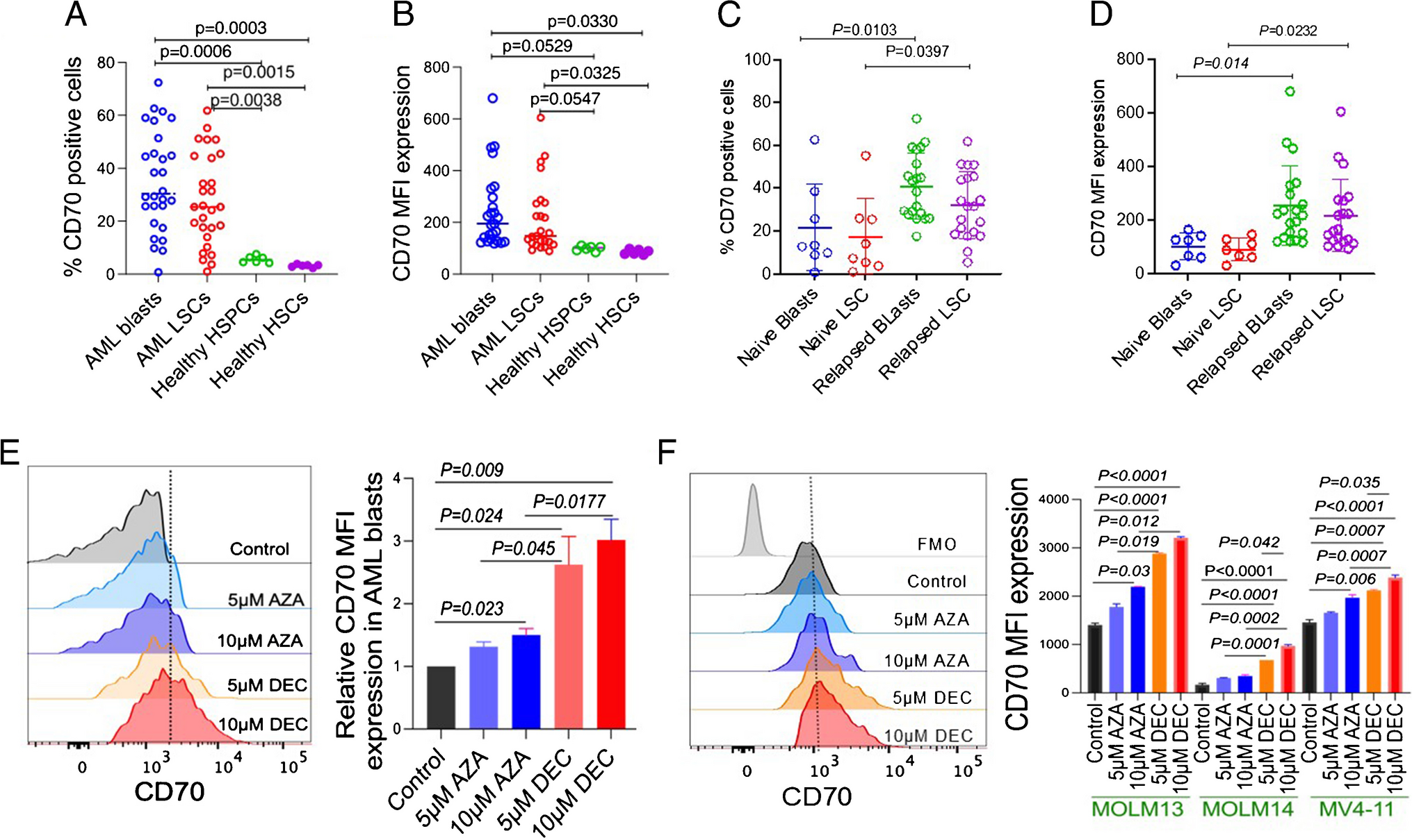 CD70 expression is significantly increased in patient-derived AML blasts and leukemic stem cells (LSC), as well as in relapsed patients following exposure to HMA. A, B Graphs showing the percentage of CD70 positivity (A) and mean fluorescent intensity (MFI) (B) on AML blasts and LSCs compared to healthy HSPCs and HSCs. C, D Graphs showing CD70 percentage (C) and CD70 MFI (D) on AML blasts and LSCs of treatment naïve and relapsed AML patients. E CD70 expression as detected by FC in untreated, 5-azacytidine (AZA)-, and decitabine (DEC)-treated AML blasts for 24 h. Left panel shows representative CD70 expression histograms; right panel shows relative CD70 MFI expression from three naïve AML patients after HMA treatments. F CD70 expression and CD70 MFI expression in three AML cell lines (MOLM13, MOLM14, and MV4-11) before and after treatment with AZA and DEC for 24 h. Left panel shows representative CD70 expression histograms; right panel shows combined CD70 expression data from all the AML cell lines