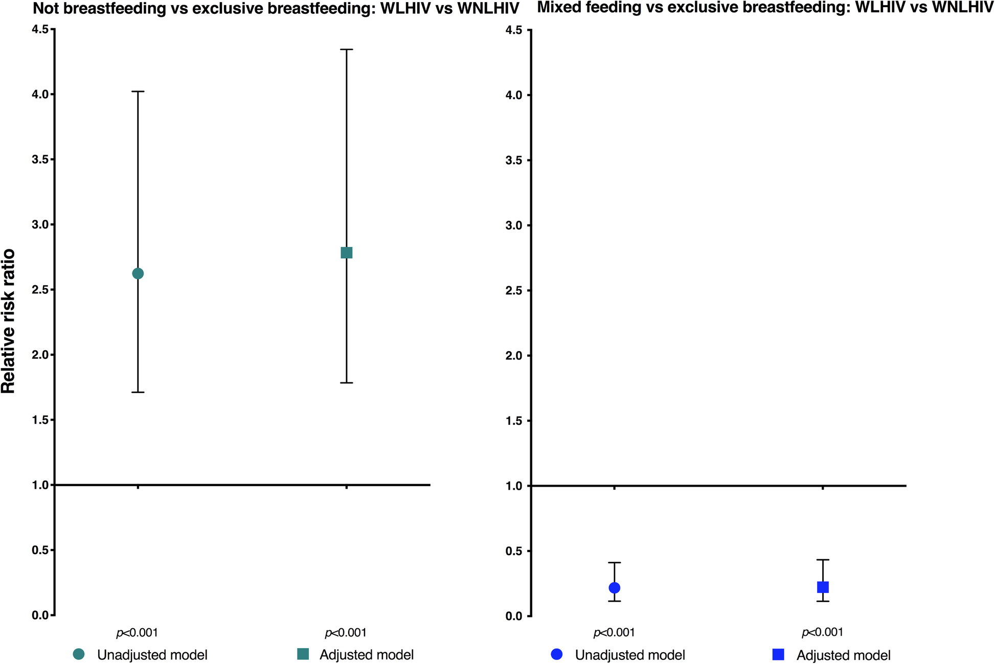 We analysed data from 1693 women with early postnatal and 471 with 6-week postnatal interviews. HIV prevalence was 47% (95% confidence interval [CI] 42, 52%). Women living with HIV were more knowledgeable than women not living with HIV on correct infant feeding recommendations (adjusted risk ratio, aRR, 1.08, p < 0.001). More women living with HIV (33%; 95% CI 26, 41%) were not breastfeeding than women not living with HIV (15%; 95% CI 11, 21%). However, among women who were currently breastfeeding their infants, fewer women living with HIV (5%; 95% CI 2, 9%) mixed fed their babies than women not living with HIV (21%; 95% CI 14, 32%). In adjusted analyses, women living with HIV were more likely to avoid breastfeeding (adjusted relative risk ratio, aRRR, 2.78, p < 0.001) and less likely to mixed feed (aRRR 0.22, p < 0.001) than women not living with HIV.