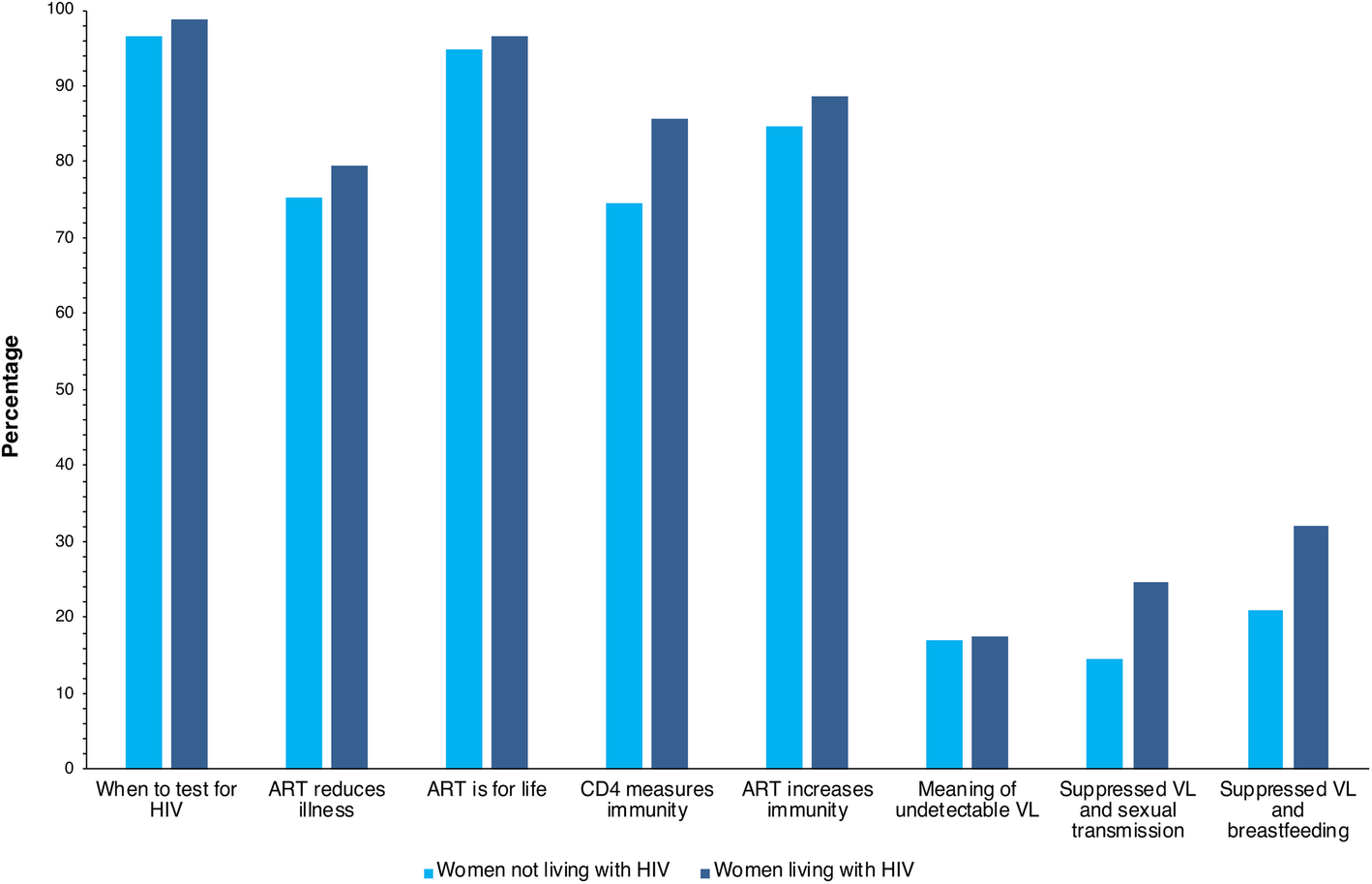 We found differences in infant feeding knowledge and practice among women living with HIV and women not living with HIV. We also found poor knowledge of the role of HIV viral load in monitoring treatment response and transmission. These findings may be due to differences in quality of health worker messages on feeding and low utilisation of HIV viral load in clinical practice.