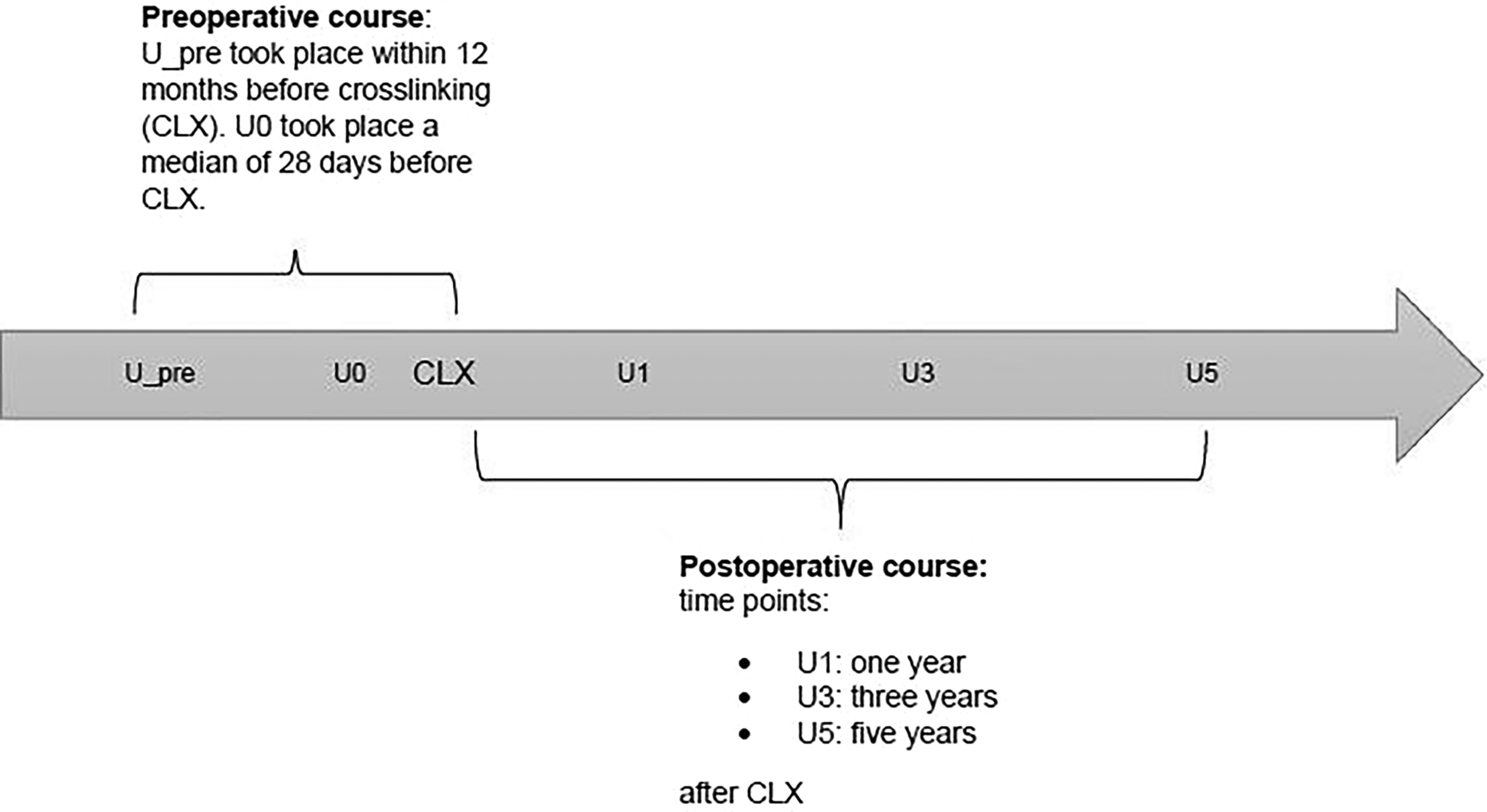 Indication for CXL treatment was based on the observed differences (KC progress) between two time points, U_pre and U0. U0 was a median of 1 month prior to treatment. The time of U0 is used as reference for all follow-up periods (Fig. 1).