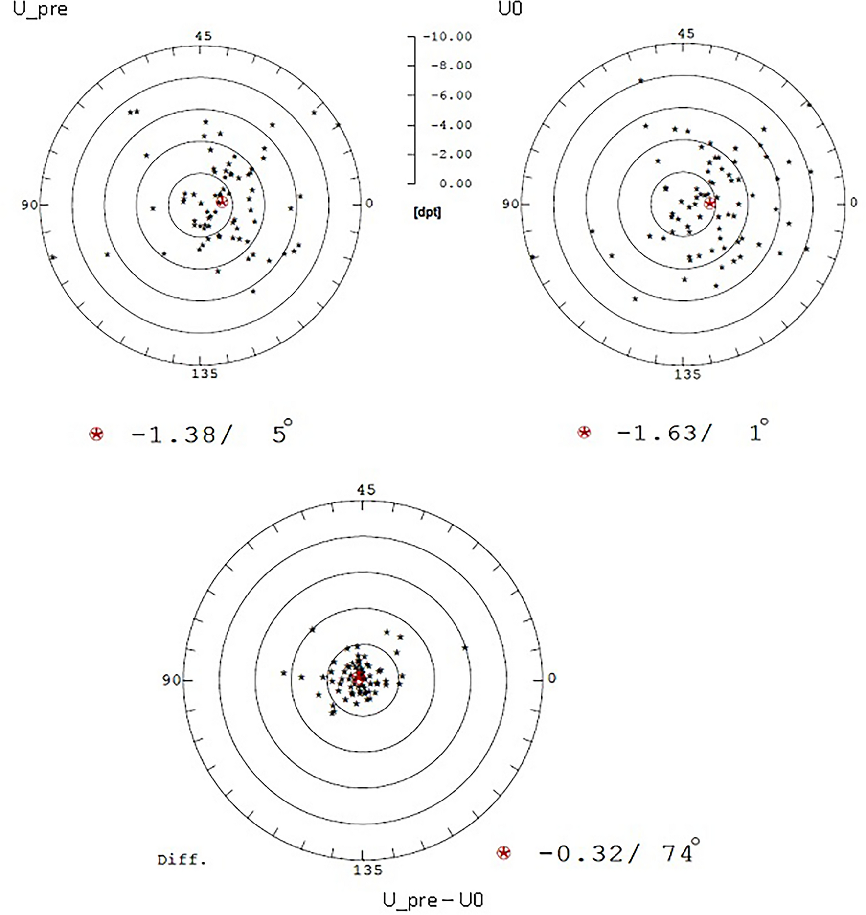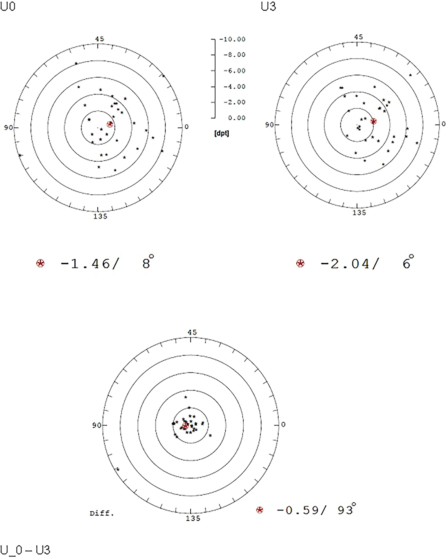 Graphical vector analysis of the astigmatic data of the anterior surface at time points U0 and U3 and vectorial difference for the group with the values; power in diopters and the corresponding steep axis in degrees. The vector mean (centroid) is marked in red