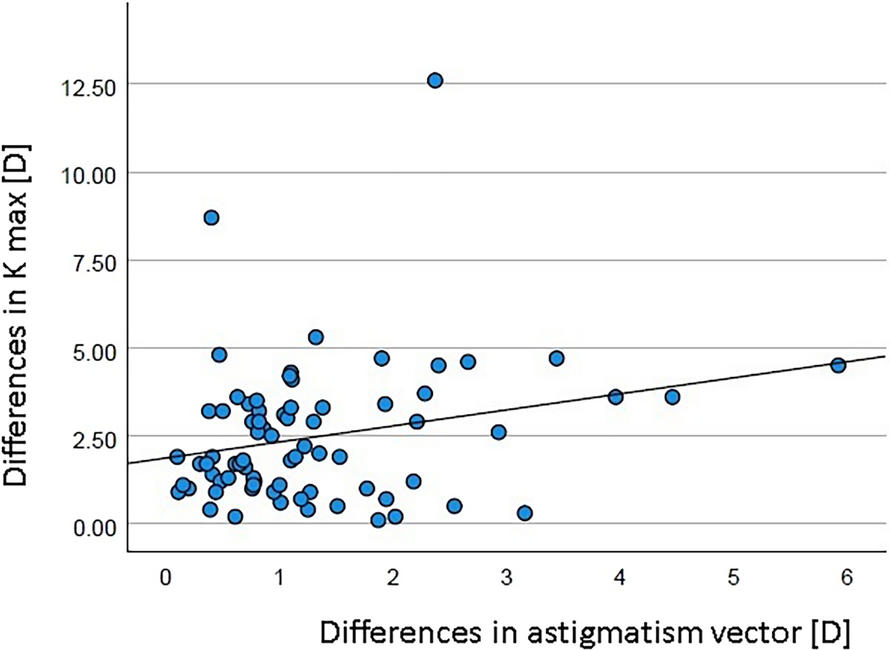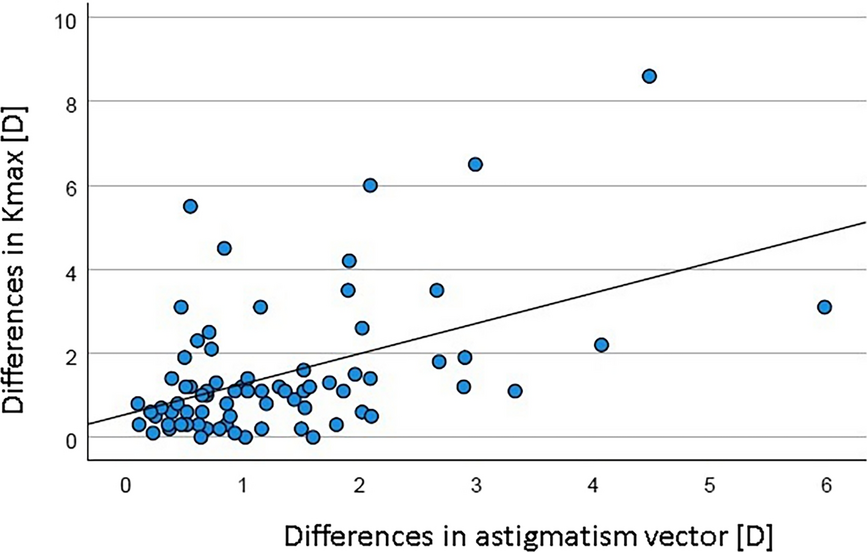 To test whether there was an association between changes in the Kmax values and the strength of astigmatism in the preoperative course, the Spearman rank correlation coefficient was calculated. For this calculation, the absolute value of the difference between the Kmax values and the absolute value of the vector difference in the astigmatism strength at the two examination times were used.