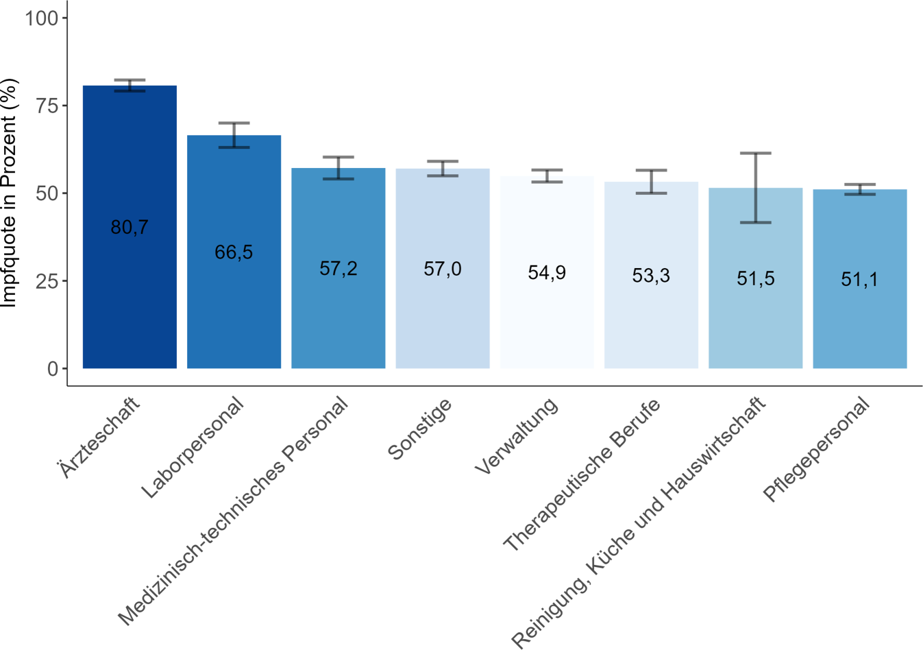 Die Impfquote für alle befragten Klinikmitarbeiter:innen lag bei 58,7 % (KI: 57,9–59,4). Männer haben die Influenza-Impfung mit 63,8 % signifikant häufiger in Anspruch genommen als Frauen (56,8 %; chi2(2) = 68,89; p < 0,001). Die Influenza-Impfquote unterschied sich signifikant zwischen den Altersgruppen (chi2(4) = 906,2; p < 0,001). Von den 18- bis 29-Jährigen haben sich 41 % in der Saison 2022/2023 gegen Influenza impfen lassen, in der Altersgruppe 30–39 Jahre waren es 51,8 % und bei den 40- bis 49-Jährigen 61,6 %. Die Impfquote für die Altersgruppe 50–59 Jahre lag bei 68,8 % und bei den ab 60-Jährigen waren 82,1 % geimpft. Darüber hinaus gab es signifikante Unterschiede bei der Inanspruchnahme der Influenza-Impfung zwischen den Berufsgruppen (chi2(7) = 650,51; p < 0,001, Abb. 1). Ärzt:innen nahmen die Influenza-Impfung in der Saison 2022/2023 signifikant häufiger in Anspruch als Pfleger:innen (chi2(1) = 591,2; p < 0,001).