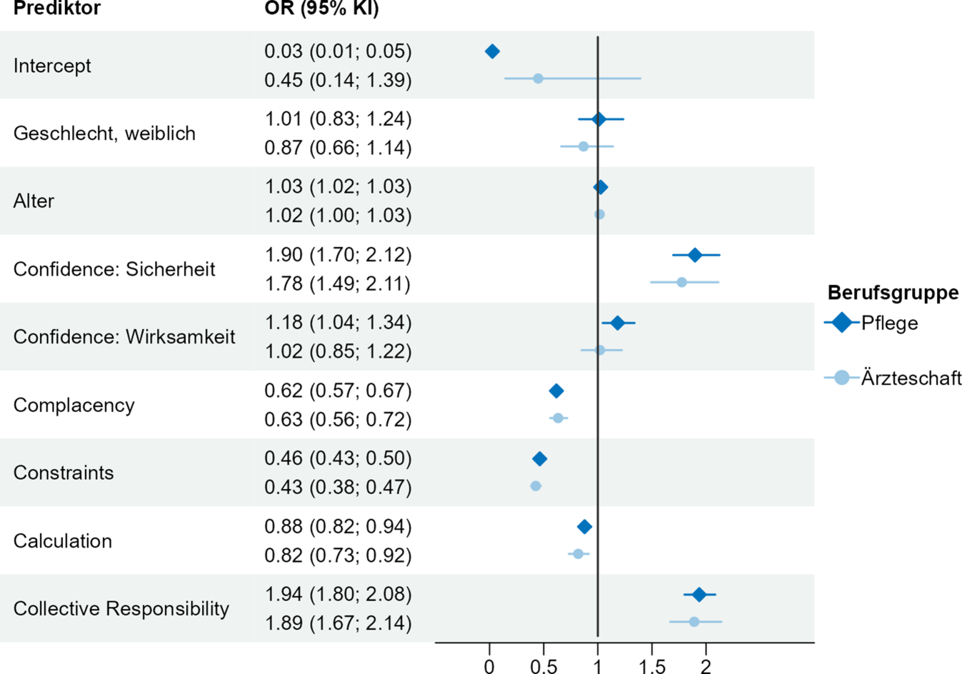 Auch für das Regressionsmodell der Pflege sind die oben genannten Voraussetzungen erfüllt. Dem Modell liegt eine Stichprobe bestehend aus N = 2443 geimpften und N = 2338 ungeimpften Pfleger:innen zugrunde. Für das Pflegepersonal hingen alle untersuchten psychologischen Determinanten signifikant mit dem Impfverhalten zusammen. Alleine das Geschlecht war nicht signifikant mit dem Impfverhalten der Pflegenden assoziiert. Auch hier zeigen die Odds Ratios von Collective Responsibility sowie dem Vertrauen in die Sicherheit der Impfung (Confidence) die stärkste Assoziation mit dem Impfverhalten. Die Chance, geimpft zu sein, erhöhte sich um den Faktor 1,94, je mehr das Pflegepersonal zugestimmt hat, dass die Impfung eine Maßnahme zum Schutz von Menschen mit schwachem Immunsystem ist. Mit jedem Skalenpunkt zunehmender Zustimmung, Vertrauen in die Sicherheit der Impfung zu haben, erhöhte sich die Chance des Pflegepersonals, geimpft zu sein, um den Faktor 1,9. Auch das Vertrauen in die Wirksamkeit der Impfung (Confidence) hing bei dem Pflegepersonal signifikant mit dem Impfverhalten zusammen, jedoch impliziert das Odds Ratio eine vergleichsweise schwache positive Assoziation (OR = 1,18; 95 % KI: 1,04–1,34). Negativ mit dem Impfverhalten assoziiert waren – wie auch bei der Ärzteschaft – Constraints, Complacency und Calculation (Abb. 2).