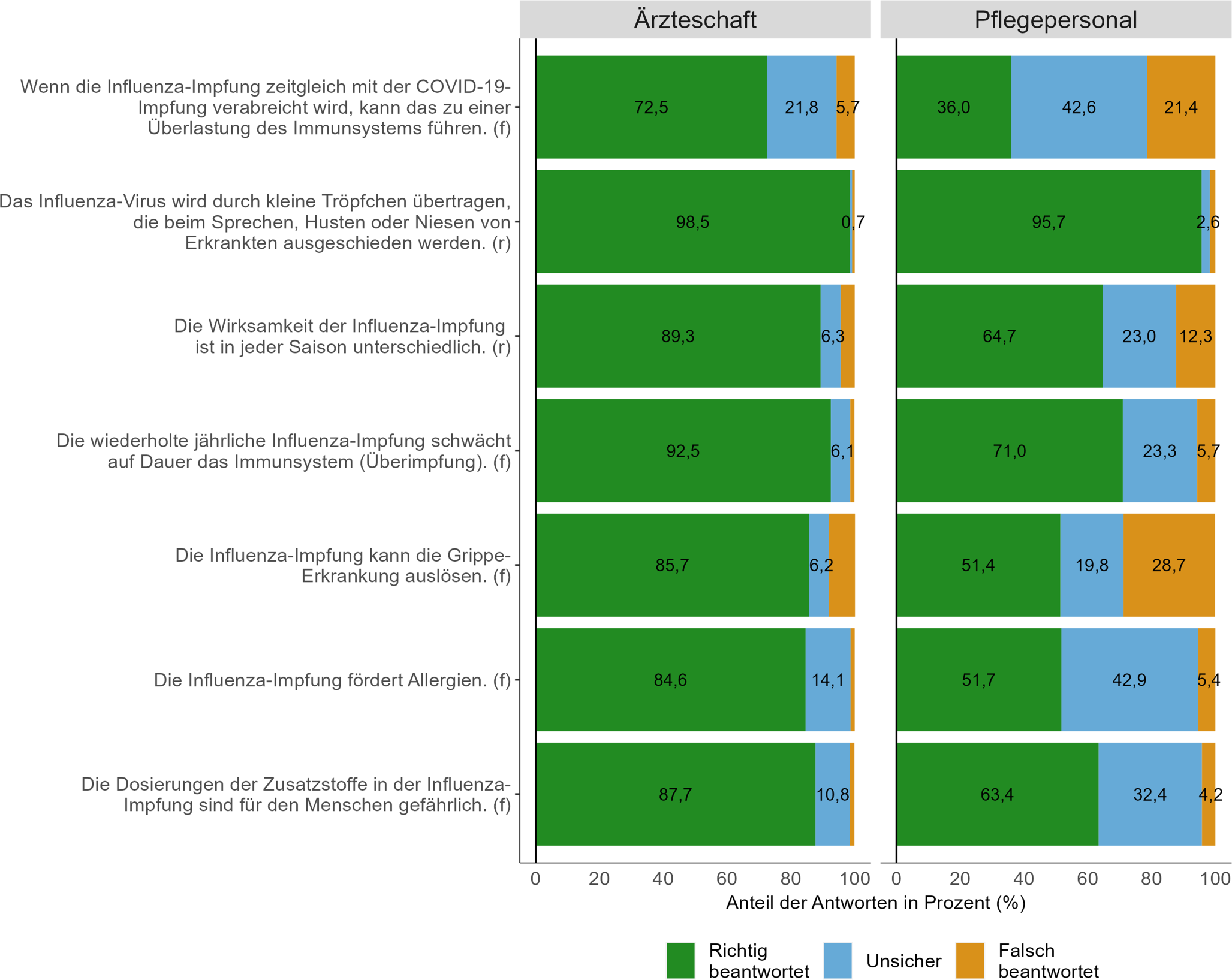 Der Fakt zur Virusübertragung durch eine Tröpfcheninfektion wurde sowohl von der Mehrheit der Ärzteschaft (98,5 %) als auch des Pflegepersonals (95,7 %) korrekt beantwortet. 42,9 % des befragten Pflegepersonals und 14,1 % der Ärzteschaft beantwortete die Falschaussage, die Impfung fördere Allergien, mit „unsicher“. Der höchste Anteil falscher Antworten des Pflegepersonals liegt mit 28,7 % bei der Falschaussage, die Impfung könne die Grippeerkrankung selbst auslösen. Auch von den Ärzt:innen fiel der größte Anteil falscher Antworten auf dieses Item (8,2 %). Die falsche Aussage, dass eine zeitgleiche Gabe der Influenza- und COVID-19-Impfung zu einer Überlastung des Immunsystems führen könne, erkennen 72,5 % der Ärzteschaft bzw. 36,0 % des Pflegepersonals als Falschaussage. Damit wurde dieses Wissensitem von den wenigsten Befragten richtig beantwortet.