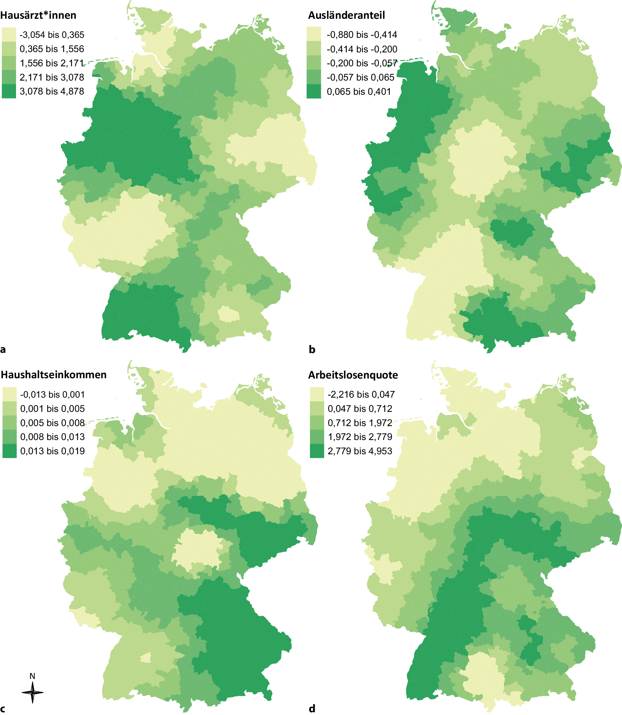 38]. Der positive Zusammenhang zwischen der regionalen Arbeitslosen- und Impfquote ist zunächst nicht eindeutig zu interpretieren. Möglich wäre es, dass in Regionen mit höherer Arbeitslosenquote auch die Krankheitslast insgesamt erhöht ist, was eine häufigere Inanspruchnahme ambulanter Versorgungsstrukturen mit sich bringen könnte. Dieser erhöhte Kontakt zu Ärzt*innen könnte zur Folge haben, dass mehr Menschen mit Impfangeboten konfrontiert sind und sich daher auch impfen lassen. Weiterhin können auch soziale Normen und Netzwerke einen Einfluss auf das Impfverhalten haben. In Regionen mit einer hohen Akzeptanz von Impfungen steigt die Wahrscheinlichkeit, dass sich Einzelpersonen impfen lassen, da Impfungen als soziale Norm wahrgenommen werden. Umgekehrt können in Regionen mit einer stärkeren impfkritischen Haltung, verstärkt durch soziale Medien oder lokale Gruppendynamiken, niedrigere Impfquoten beobachtet werden [