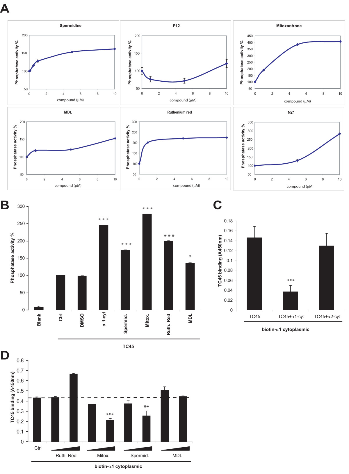 Here we have performed a high-throughput screen (HTS) with recombinant TCPTP (TC45) to identify novel activators of the enzyme. We demonstrate that six structurally distinct compounds are capable of activating TC45 in vitro and that one of these, spermidine, functions in cells to inhibit proliferation, PDGFRβ phosphorylation and VEGF-induced angiogenic sprouting in a TC45-dependent manner. We also show that spermidine and mitoxantrone compete with α1-cyt in activating TC45, suggesting that they function by disrupting the inhibitory intra-molecular bond in TCPTP. These lead compounds could be used for rational design of TC45 agonist with improved properties.