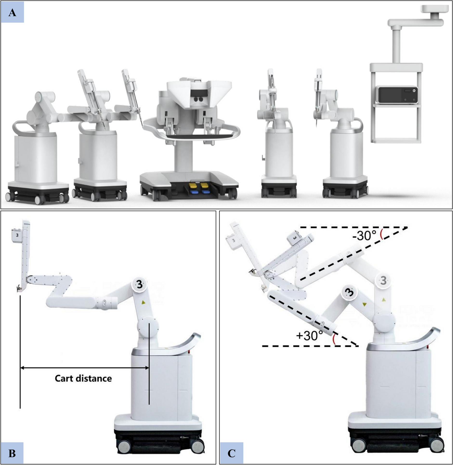The Carina™ Platform. A Four independent patient carts, a surgeon console, and an integration hub. B Example of cart distance. C Example of operation space setting: − 30° and + 30° position